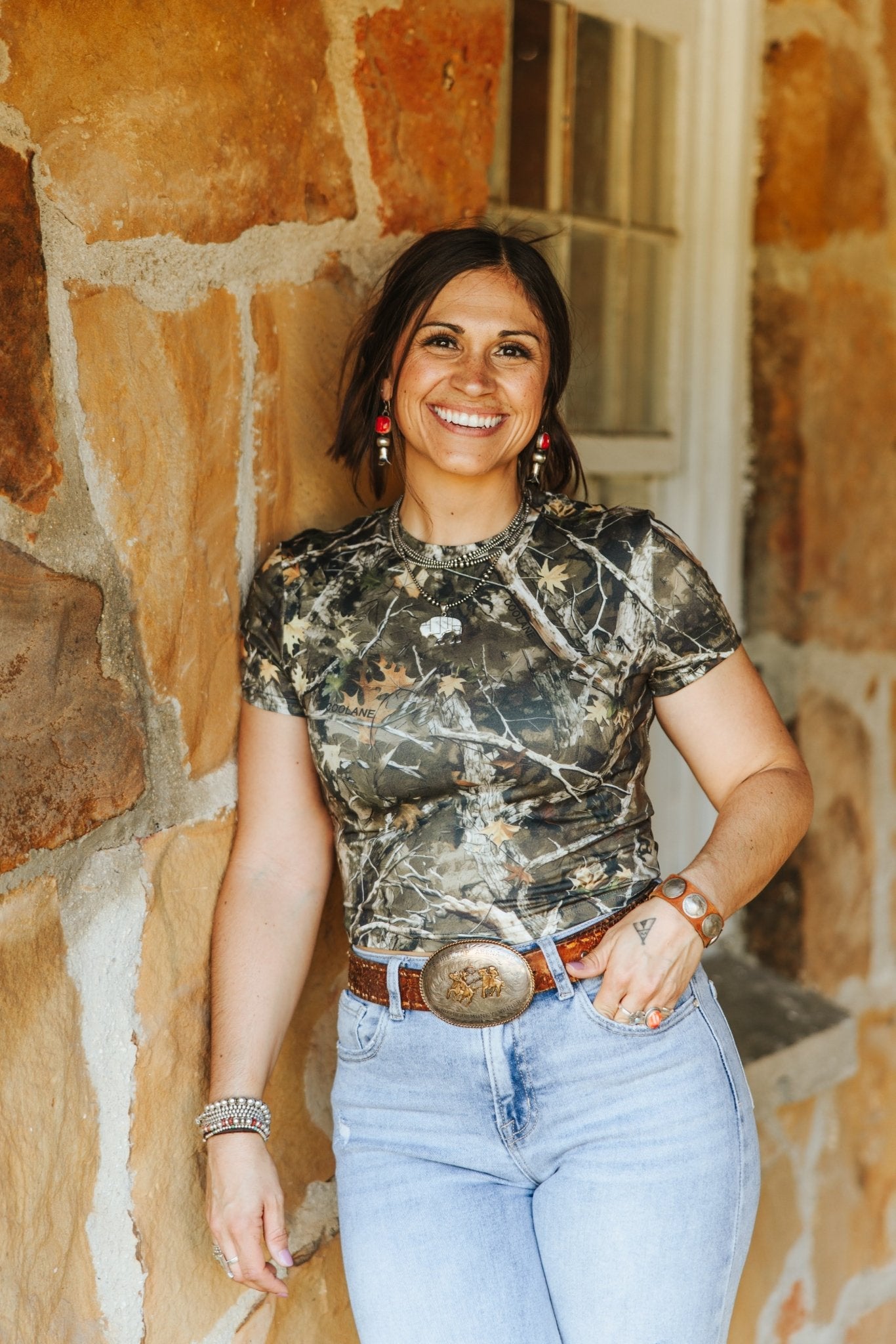 The Tree Camo Crop Top brings a whole lotta sass to the stand or the street. With its cropped fit and bold camo print, it’s equal parts country grit and hot girl energy—perfect for pairing with cutoffs, cargos, or your favorite high-rise jeans. Huntin’, fishin’, or just chillin’—this one’s made for makin’ noise.