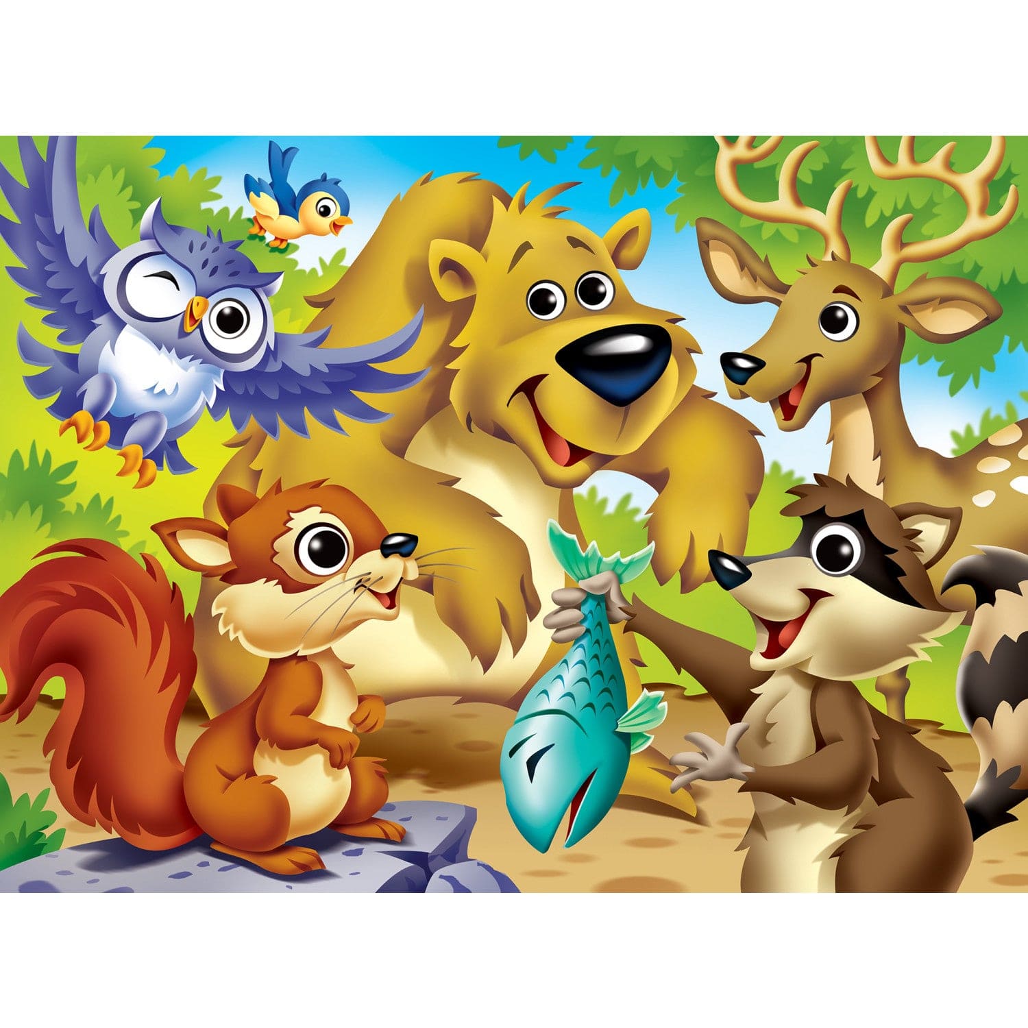 Introducing the Googly Eyes - Woodland Animals 48 Piece Kids Puzzle! Step into the enchanting world of woodland creatures with this captivating puzzle featuring an array of adorable animals. Explore the forest as you piece together the puzzle, which includes charming illustrations of an owl, bear, bird, deer, raccoon, squirrel, and fish. With dimensions of 19" x 14", this puzzle provides an engaging challenge for young minds to complete. The puzzle is adorned with (2) 24mm and (4) 18mm pre-mounted, factory-secured wiggly and googly eyes, adding a playful and interactive element to the puzzle experience. Crafted with thick 100% recycled puzzle board and featuring random cut pieces, this puzzle ensures a tight interlocking fit and guarantees durability for repeated play. Designed for children aged 4 and above, the Googly Eyes - Woodland Animals 48 Piece Kids Puzzle has been recognized as the winner of the Tilliwig Toy Top Fun Award and Creative Child Preferred Choice Award, highlighting its exceptional play value and creativity. Look for The Right Fit® puzzles collection to ensure your little one gets the correct piece count and size for a satisfying challenge.