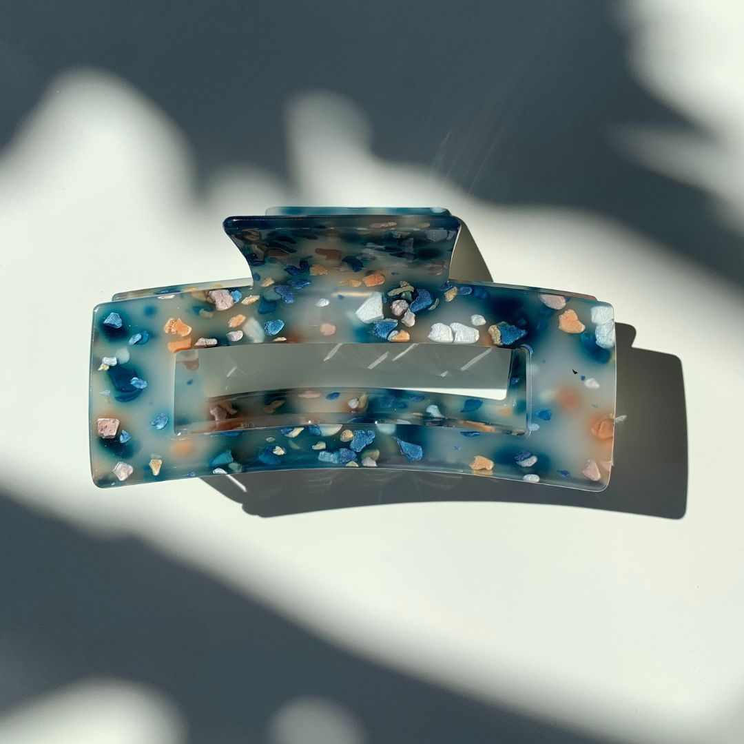 From Velvet Claws, a unique hair claw clip adorned with gorgeous peach, white, and blue flecks suspended in a blue and white surface reminiscent of a peaceful pond.