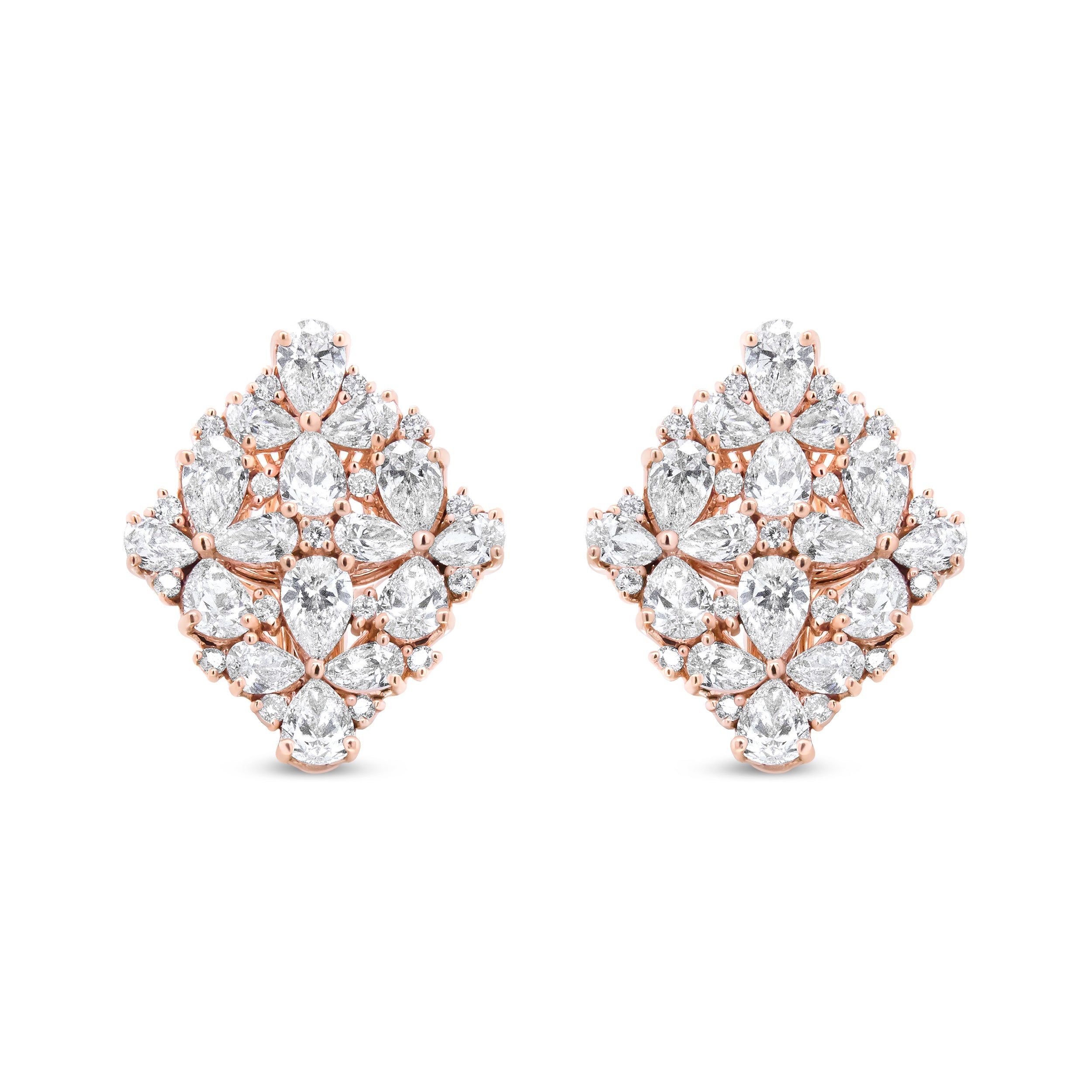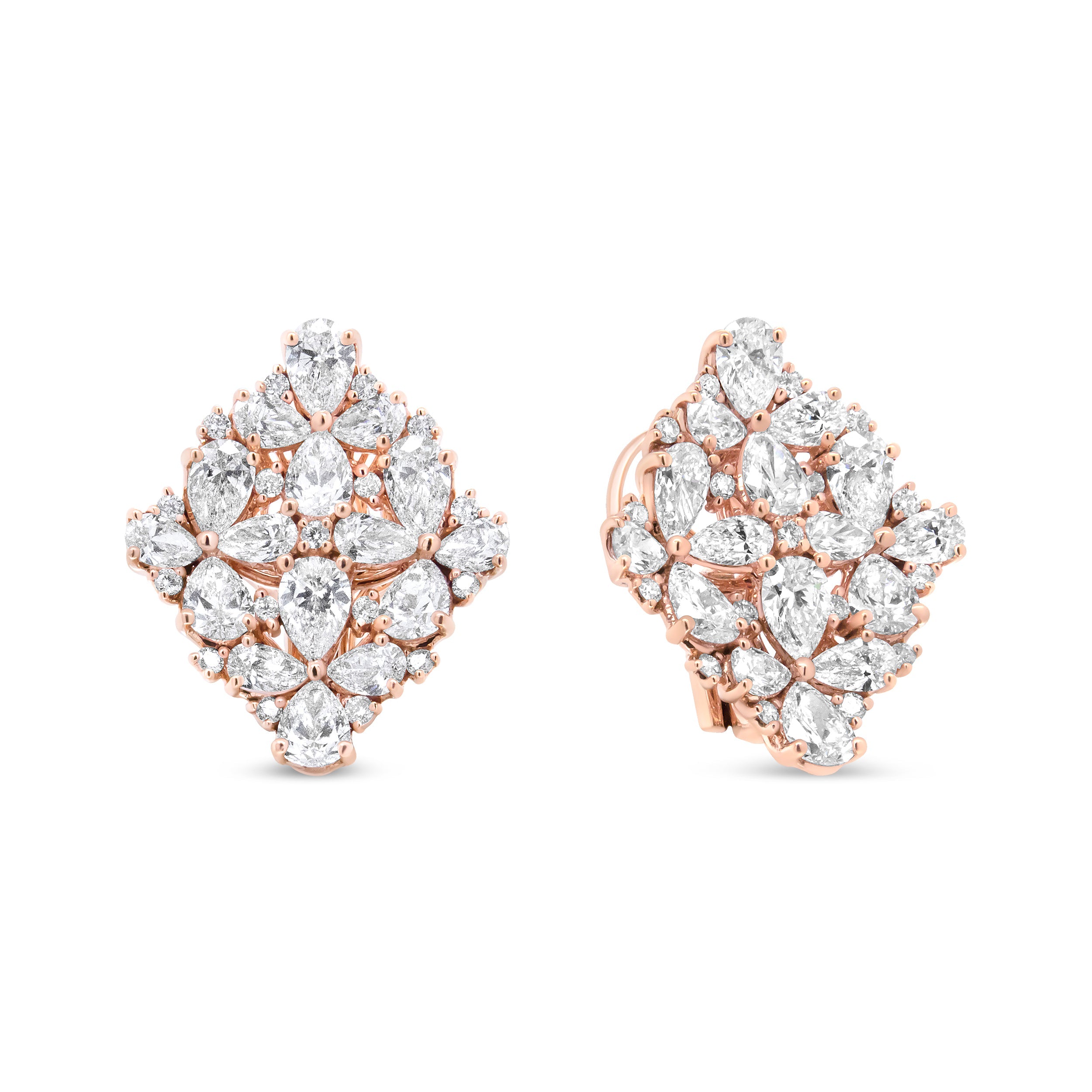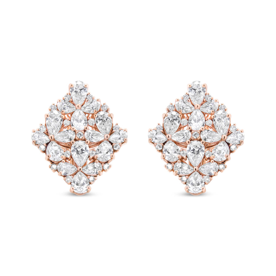 These bold earrings dazzle with a wow-factor like none other! A shimmering collection of diamonds sparkle from all over the face of these marquise-shaped earrings. Glittering pear-shaped diamonds act as the petals in this floral motif, each set in pretty prong settings. Additional round white diamonds accent these main stones, each in prong settings. Crafted of 18k rose gold, these statement earrings will have everyone doing a double-take at your ears. The diamonds total 8 1/3 cttw with an approximate F-G Color and VS1-VS2 Clarity. Omega clip on findings keep these pierced earrings safe and secure on your ears for comfortable wear all day long.