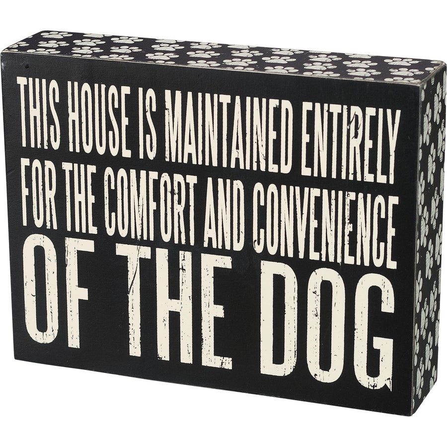 A classic black and white wooden box sign featuring a distressed "This House Is Maintained Entirely For The Comfort And Convenience Of The Dog" sentiment with paw print trim designs. Easy to hang or can free-stand alone.