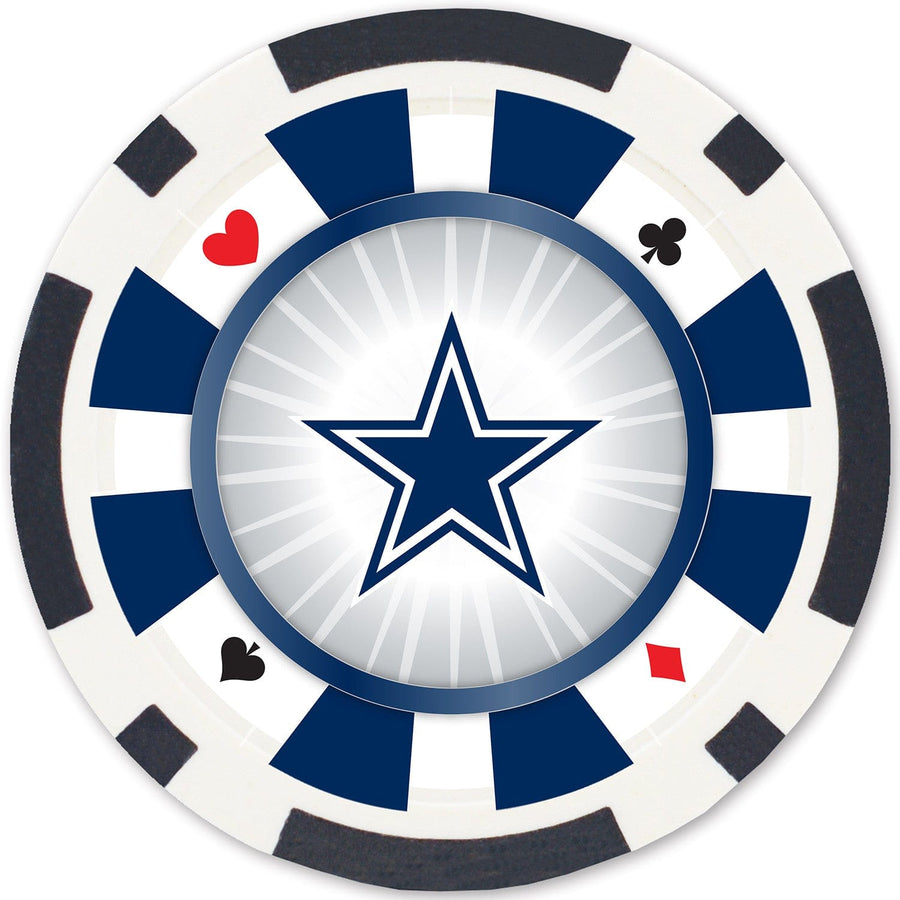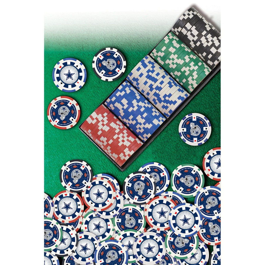 Experience the thrill of the game with the Dallas Cowboys NFL Poker Chips 100pc set by Masterpieces. This officially licensed NFL product features 100 casino-style poker chips, each weighing a substantial 11.5 grams, ensuring a high-quality feel during play. The chips are adorned with the iconic Dallas Cowboys team designs, making them a must-have for any fan. The set includes a sleek black tray that holds five rows of 20 chips, providing easy storage and organization. Perfect for game nights, this poker chip set is designed for families and fans alike, offering a fun way to show team spirit. The compact dimensions of 8.5 x 3.27 x 2.25 inches make it easy to transport, whether you're hosting a poker night at home or taking the excitement on the road. Made with durable materials, this set is built to last, offering countless hours of entertainment. Ideal for both casual players and serious poker enthusiasts, the Dallas Cowboys poker chips set is a great addition to any collection. Whether you're a fan of the Cowboys or simply love the game, this set brings the excitement of Las Vegas poker chips to your table.