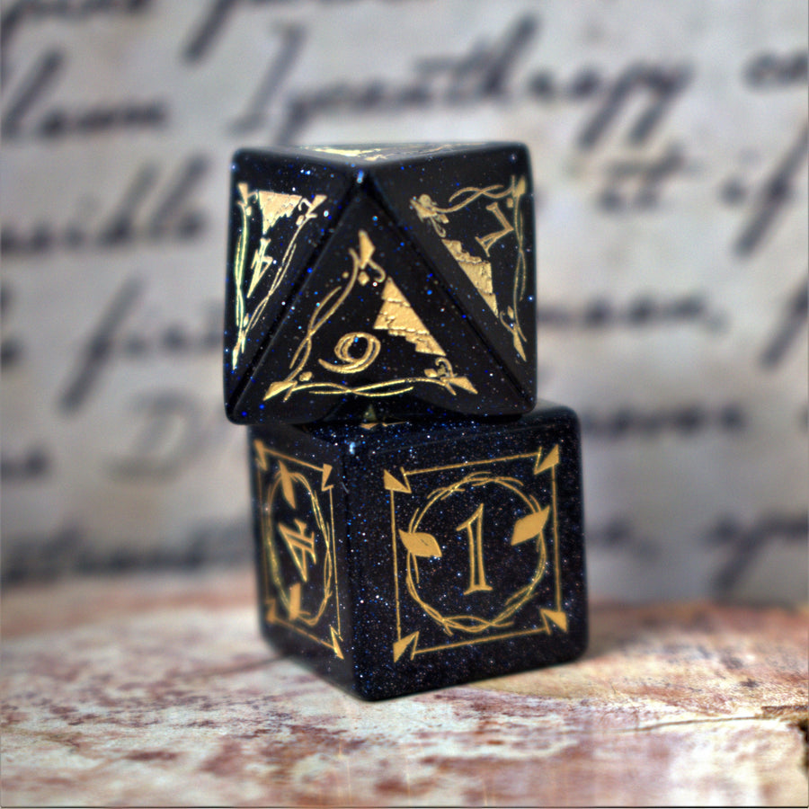 Each die is hand carved from pure gemstone and polished in a proper tumbler. Designs are then engraved into each side and hand painted. Gemstone dice are never guaranteed to have a perfectly balanced weight; however, each of our dice sets are always well weighted and well balanced.
