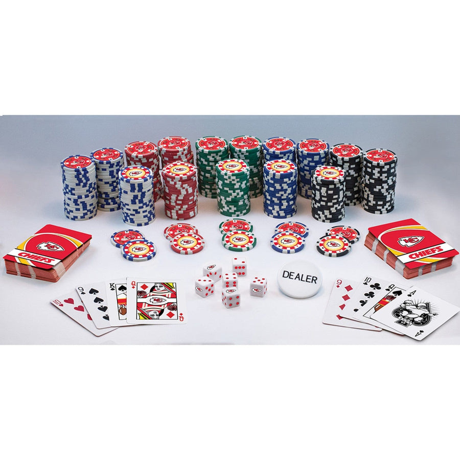 Looking for a great way to support your favorite team on poker night? Well, ante up with MasterPieces officially licensed NFL Kansas City Chiefs 300 Piece Casino Style Poker Chips! These heavy 11.5-gram chips are perfect for Texas Hold'EM, Blackjack, card games, and much more. The poker set includes 300 high-quality standard-colored poker chips (11.5g) featuring two unique team designs. 60 White Chips, 60 Red Chips, 60 Blue Chips, 60 Green Chips, and 60 Black Chips. 6 standard-size (16mm) dice featuring your team's logo and colors on each die, 2 decks of playing cards with card-back designs featuring your favorite team's logo. All face cards and jokers have detailed custom team designs. 1 dealer button. Plus, an easy-to-carry sturdy aluminum case has a black velour interior to protect and organize poker chips, playing cards, and dice.