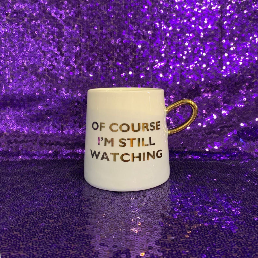 - White and blue watercolor design with "Of Course I'm Still Watching" in gold lettering