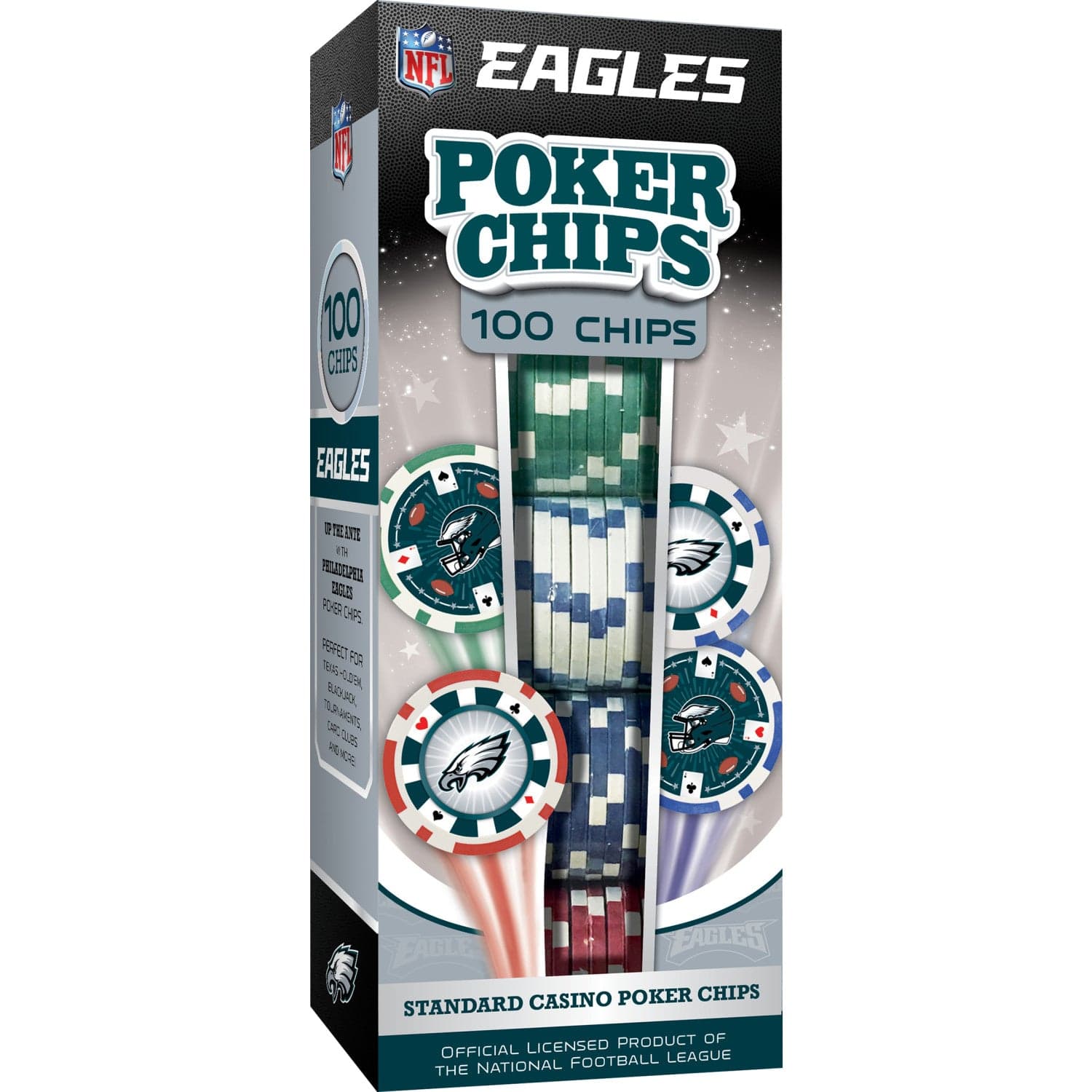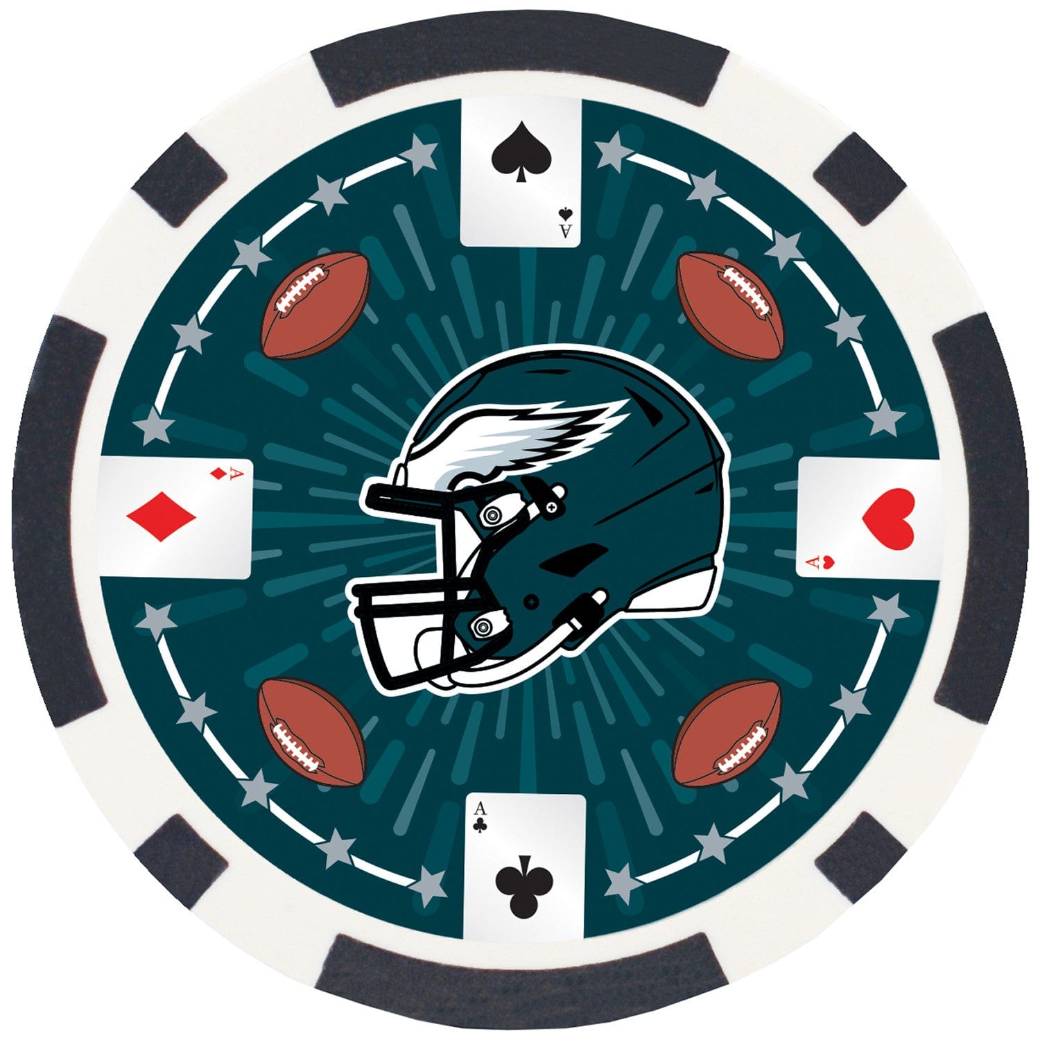 Show your Philadelphia Eagles pride at every game night with this officially licensed NFL poker chip set, featuring 100 professional-grade, 11.5-gram casino-style poker chips in a sturdy black tray for easy storage and organization. Perfect for Texas Hold'Em, Blackjack, and other card games, these standard-colored chips showcase authentic team designs, making them a must-have for any Eagles fan or collector of NFL team poker chips. Whether you’re hosting a tournament or enjoying a casual poker night, this poker set delivers the look and feel of a real casino experience. The heavy-weight chips offer a satisfying feel in hand, while the included tray keeps your set organized and ready for play. Ideal for fans looking to expand their collection of NFL poker chips or searching for the perfect gift for football enthusiasts, this set pairs perfectly with Philadelphia Eagle playing cards and complements collections that include other teams like the Ravens, Bears, Steelers, or Browns. Designed by MasterPieces, an American puzzle and game company, this set is crafted for durability and long-lasting enjoyment. Elevate your next game night, tailgate, or sports-themed party with this high-quality NFL poker chip set and show your team spirit in style.