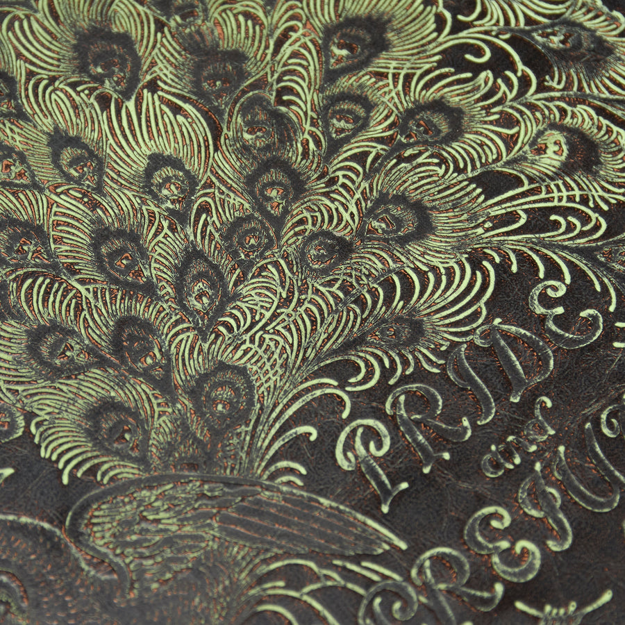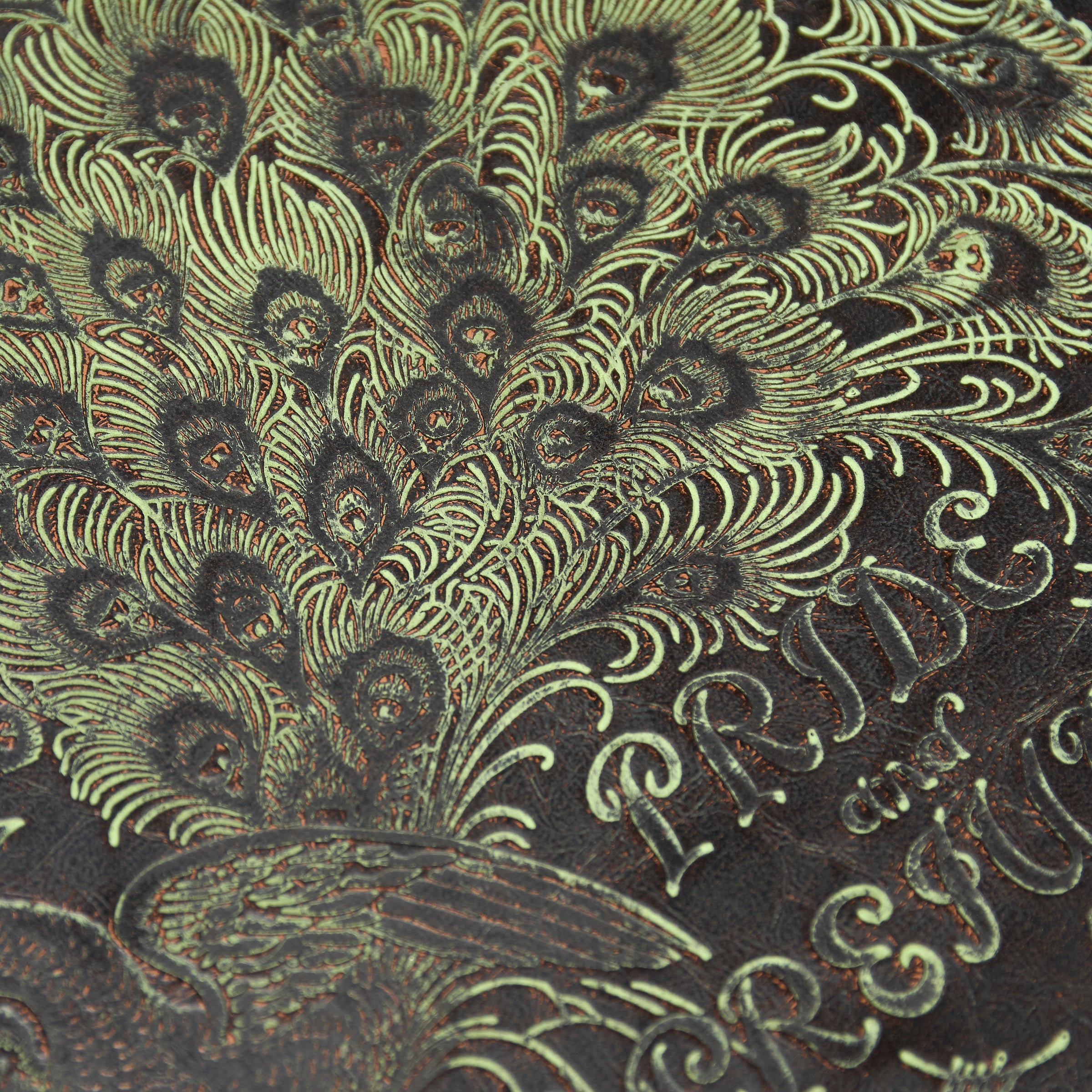 Book box features a faux leather wrap displaying the exterior of a vintage "Pride And Prejudice" book with distressed accents and embossed details throughout an art nouveau inspired feather design.