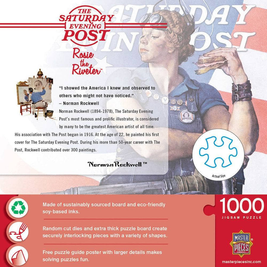 These MasterPieces Norman Rockwell - Saturday Evening Post 19.25" x 26.75" 1000pc Puzzles are sure to become family favorites. Norman Rockwell began his career in 1916 with The Saturday Evening Post. His heartwarming and humorous illustrations of everyday American life appeared on the cover of the magazine for more than 50 years and contributed over 300 paintings. From the heartwarming scene of a soldier returning home, to the humorous scene of a large family piled in a tiny car, Norman Rockwell's Saturday Evening Post images are sure to have everyone reminiscing about the good old days. This image features the iconic Rosie the Riveter. To reduce their impact on our environment, the chipboard used in these puzzles is made of 100% recycled material.