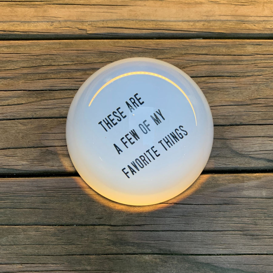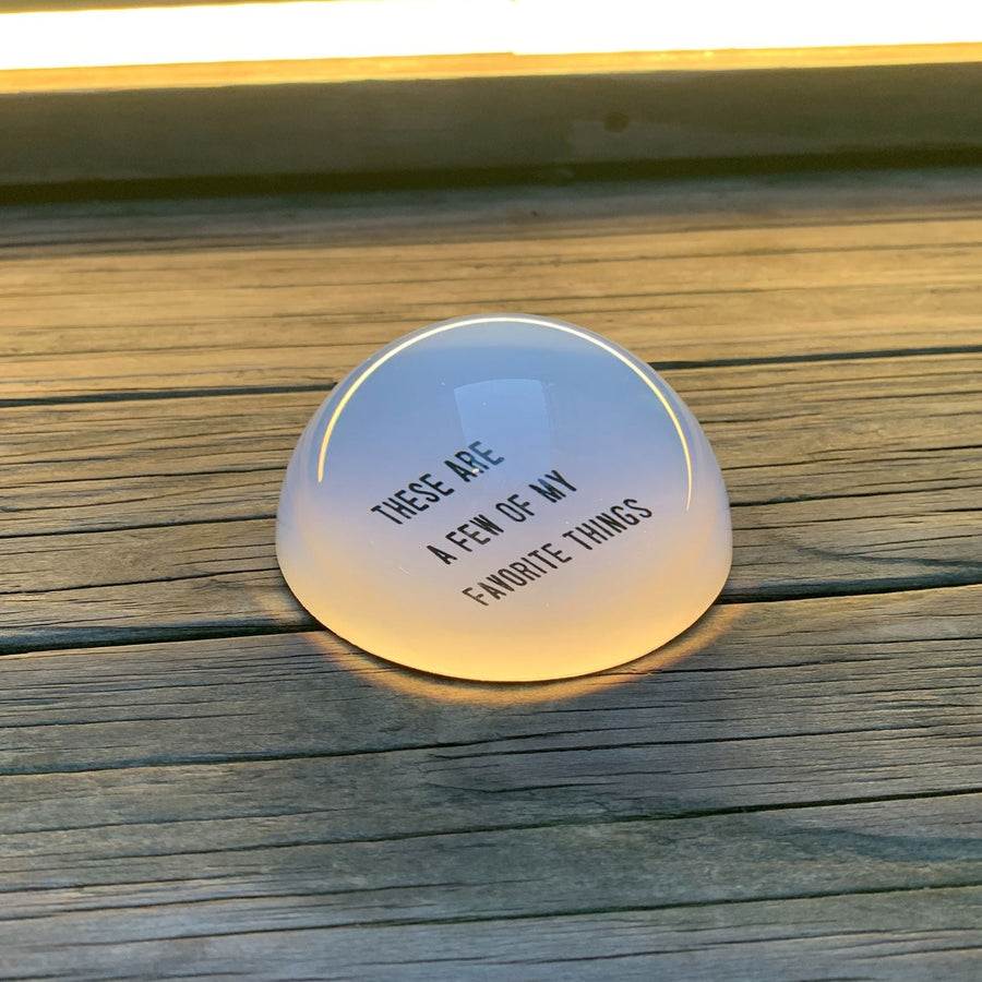 Upgrade your office desk with the These Are A Few Of My Favorite Things Glass Dome Paperweight, featuring a cute phrase to keep you focused on tasks. This 3.5" x 1.75" domed glass paperweight by Santa Barbara Design Studio makes a lovely gift for birthdays, Mother's Day, Valentines, co-workers, housewarmings, or as a thoughtful hostess gift.