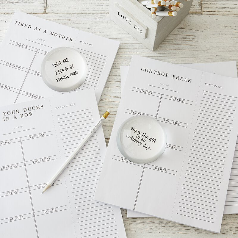 - Domed glass paperweight with a cute phrase to keep you focused on your task