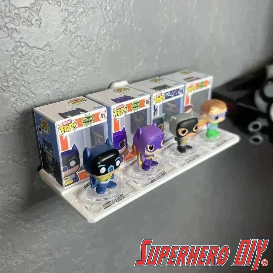 3D-printed in durable PLA plastic, this wall mount fits Funko Pop Bitty Pops of any kind! Made for displaying up to four (4) Funko Pops on one shelf, put your boxes in back and your bitty pop figures in front! You can use just one shelf or multiples to complete your amazing display!