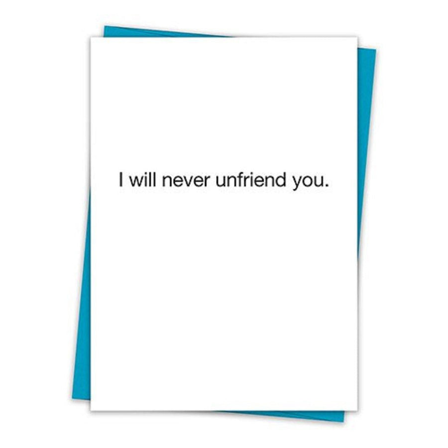 Let someone you love know you're thinking about them by sending this greeting card that reads "I will never unfriend you."