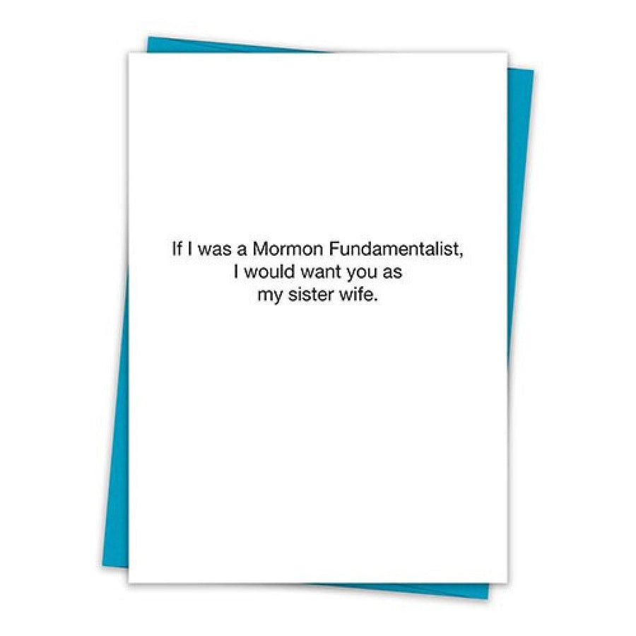 Let someone you love know you're thinking about them by sending this greeting card that reads "If I was a Mormon Fundamentalist, I would want you as my sister wife."