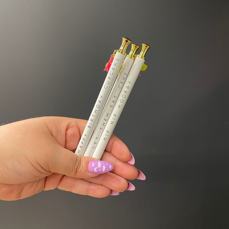 Add a touch of whimsy to your workspace with the Let Them Eat Cake Tassel Pen Set of 6, featuring fun cupcake-themed phrases like "Happy Birthday Cupcake" and "Hip Hip Hooray." These unique novelty pens are sure to delight coworkers and friends as a charming gift for birthdays or special occasions.
