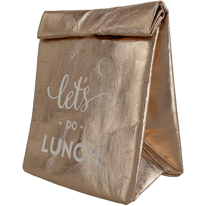 - Metallic rose gold with white print reads "Let's Do Lunch"; wipe clean with a damp cloth