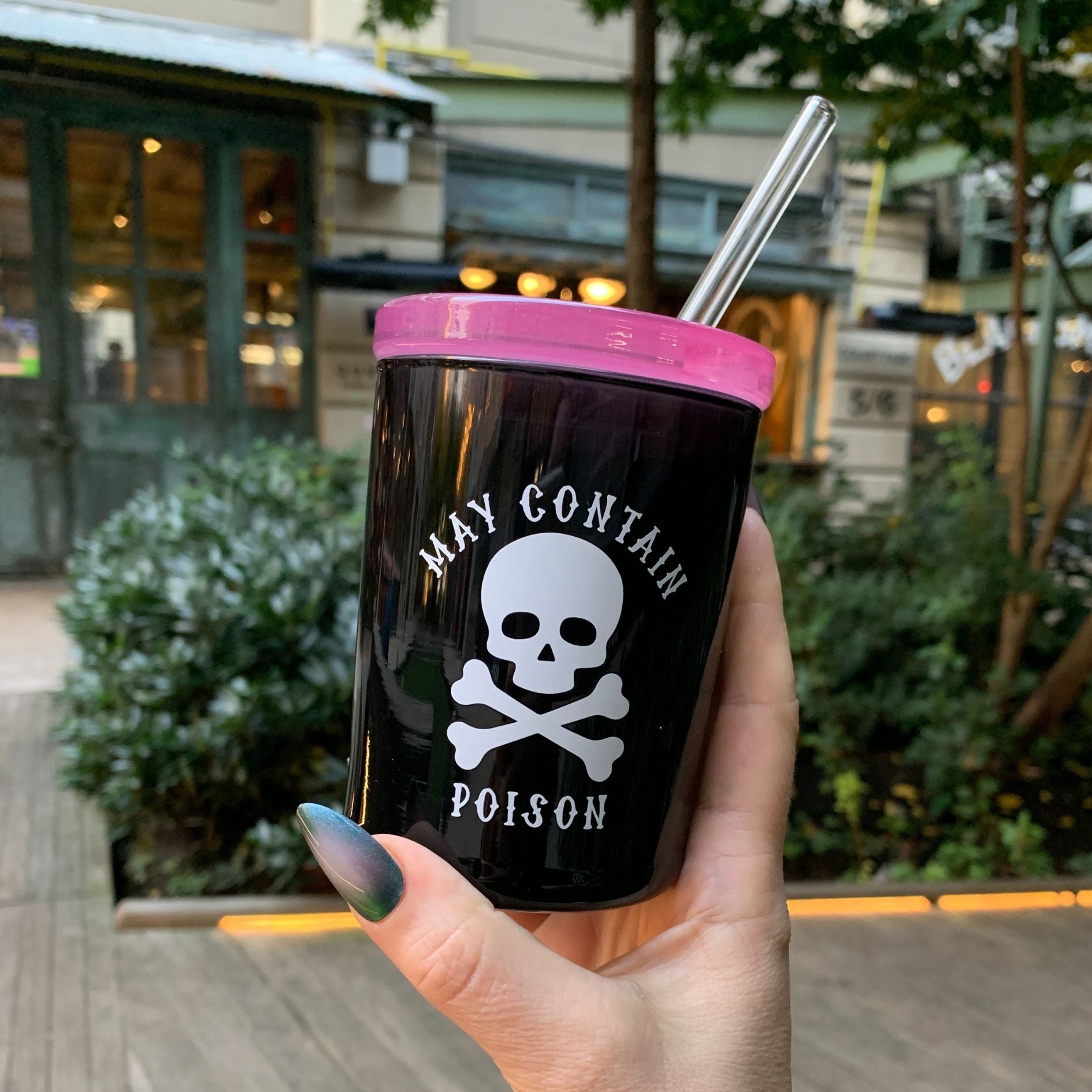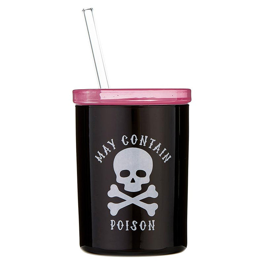 Serve up spooky cocktails in style with the May Contain Poison Glass Double Old Fashioned with Lid and Straw! This unique cocktail glass is perfect for sipping on Halloween-themed drinks and features a skull and crossbones design with a pink lid. Hand wash only. Looking for a fun and unique gift for the Halloween enthusiast in your life? This cocktail glass, complete with a glass lid and straw, is the perfect choice! Whether they're hosting a Halloween party or handing out candy to trick-or-treaters, this glass is sure to delight.