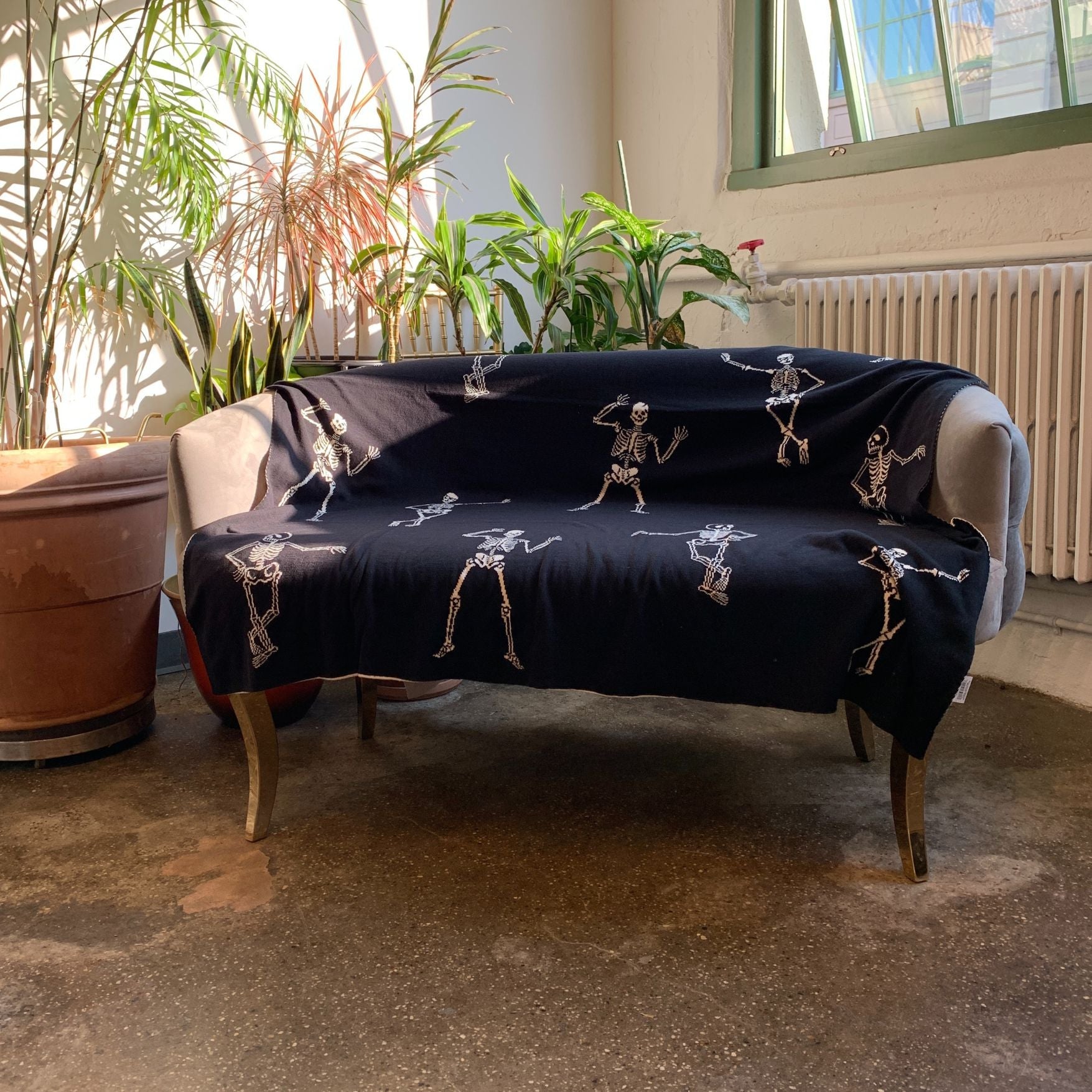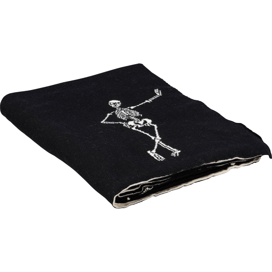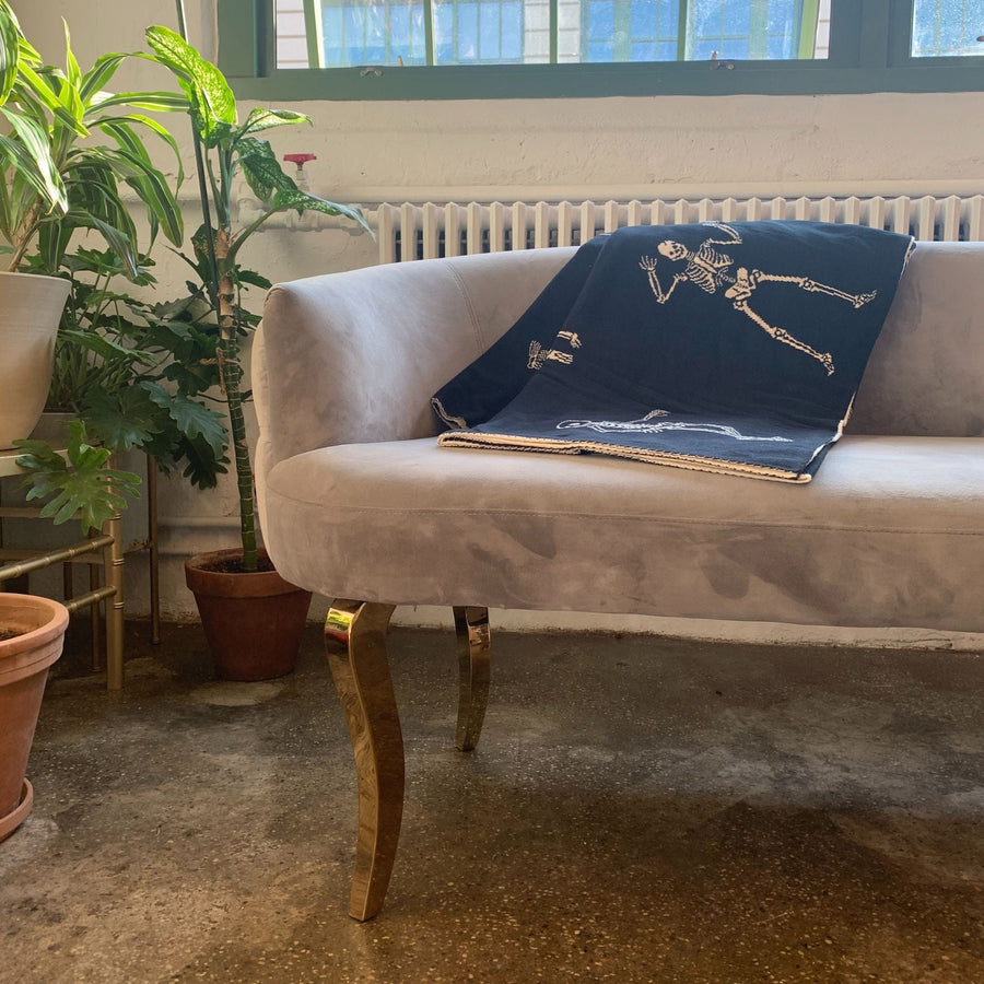 A machine-knitted black cotton throw featuring skeleton designs in lively – and dare we say playful – poses. Who says being undead is no fun?