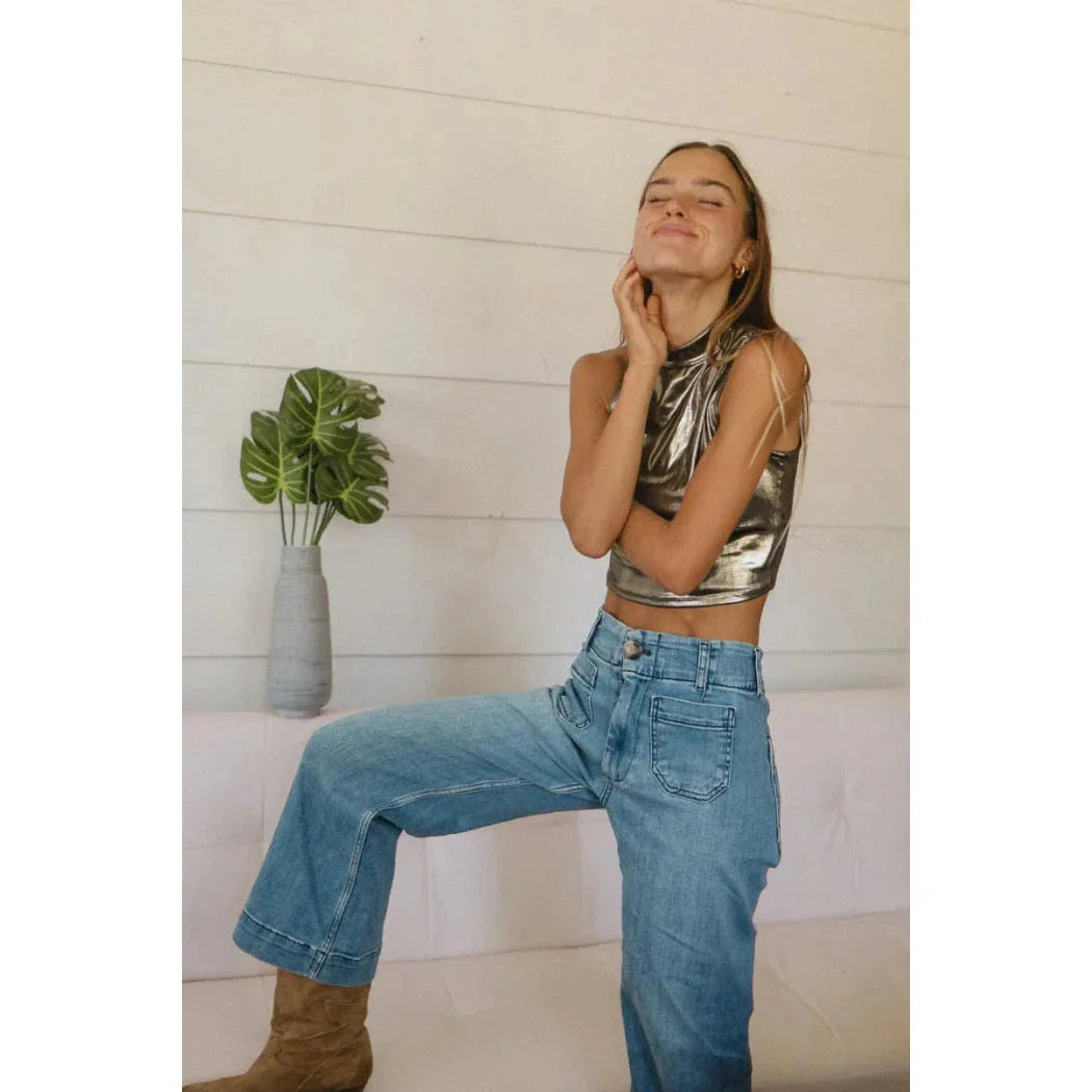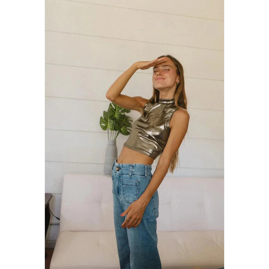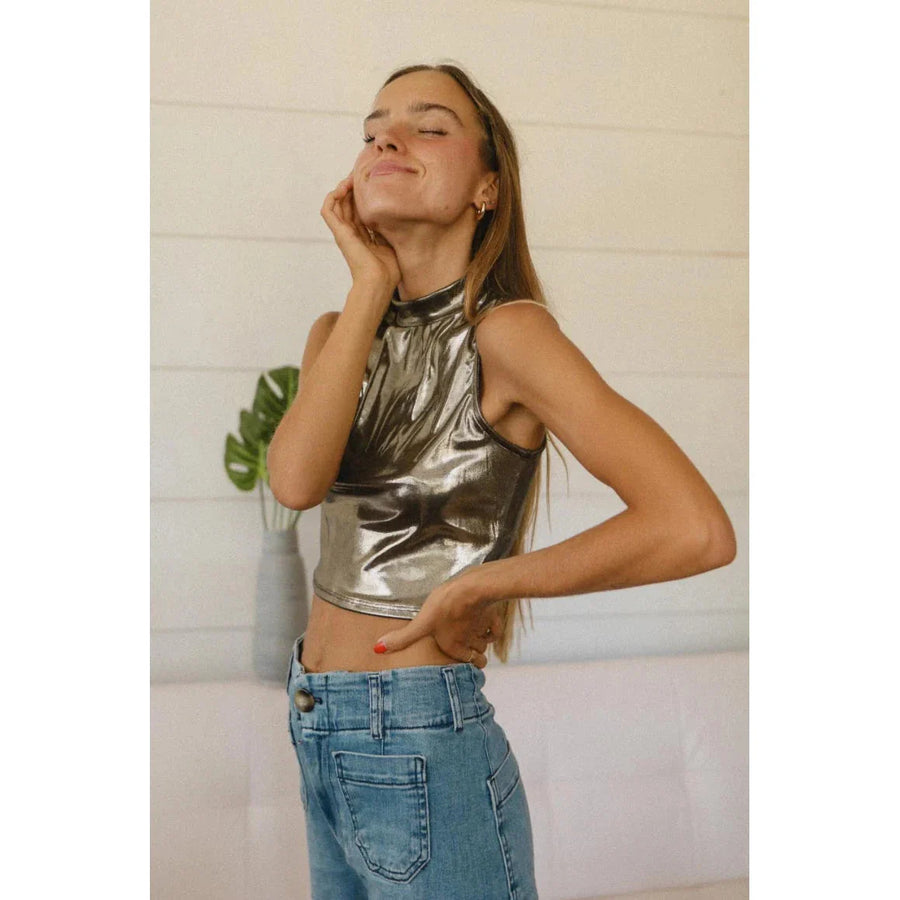 Looking to stand out at your next rave? This metallic mock neck crop top in gold or fuchsia is perfect for adding some shine to your outfit. Made in the USA with a sleeveless design and a flattering crop cut, this top is sure to turn heads. For the fashion-forward friend who loves to sparkle, this metallic mock neck crop top makes a thoughtful gift. Available in gold or fuchsia, it's a unique addition to any wardrobe and perfect for adding some glam to a night out.
