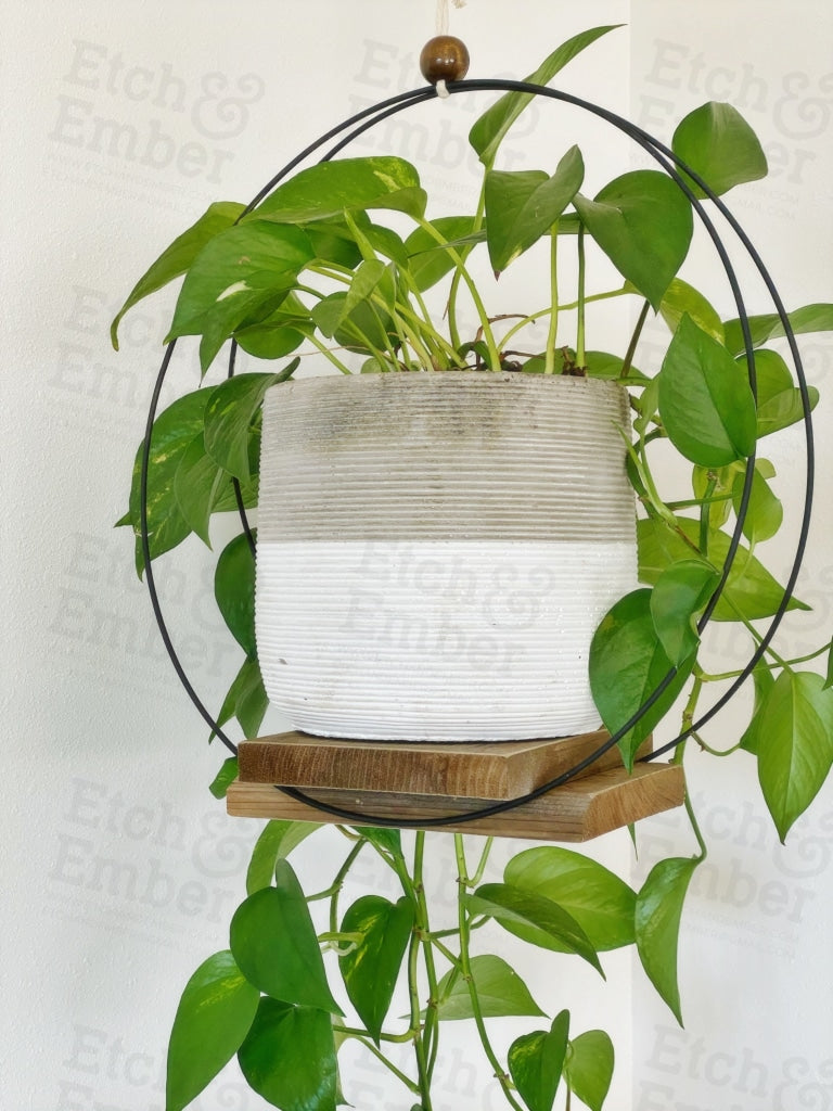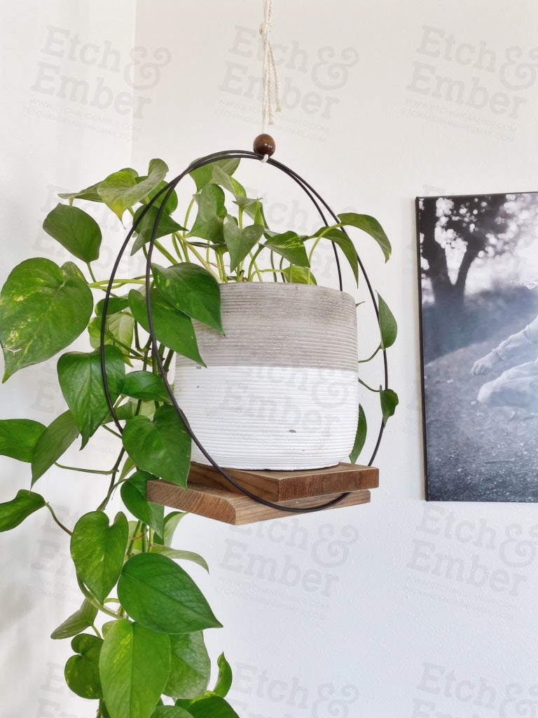 Modern plant hanger. Comes with rustic base, two 12” rings and 36” macrame cording to hang. Holds up to 20 pounds when secured into a stud. Plant and pot not included.