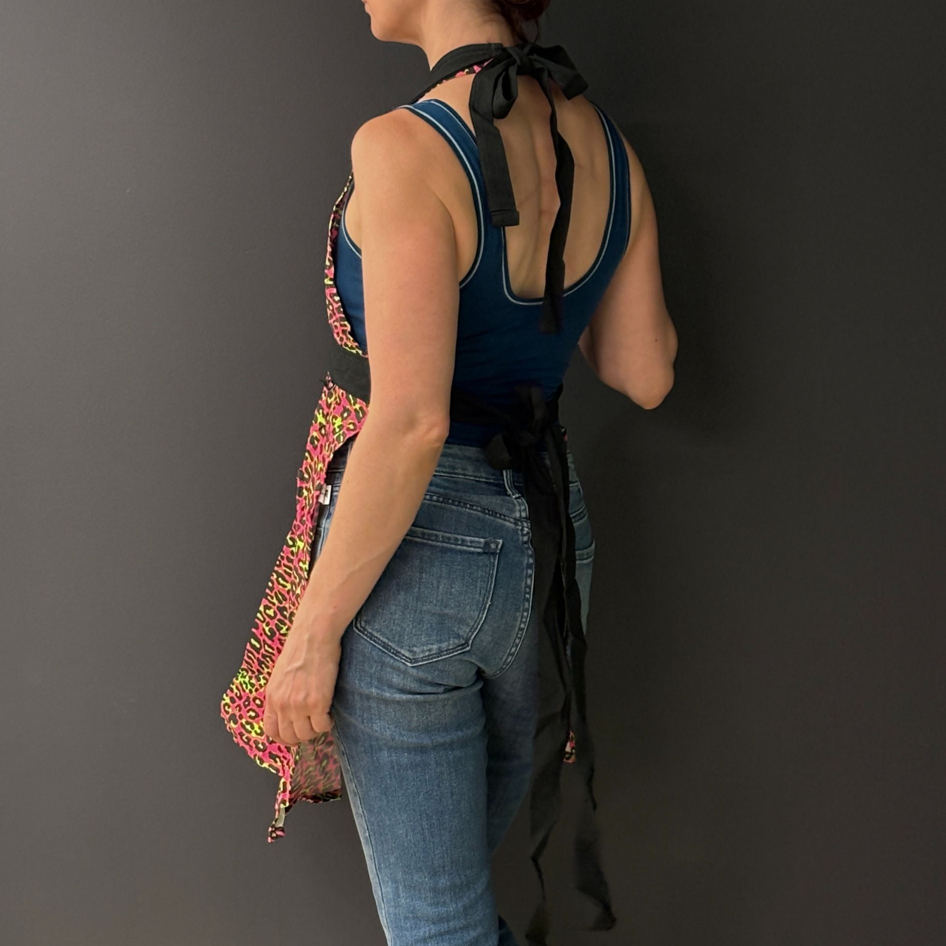 - Rocker Chic Design: Stand out in the kitchen with our bright pink leopard print apron, featuring pops of neon green and contrast red button details, all trimmed in sleek black.