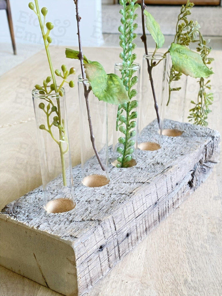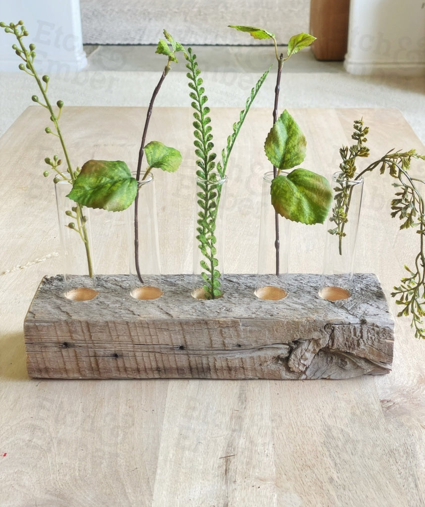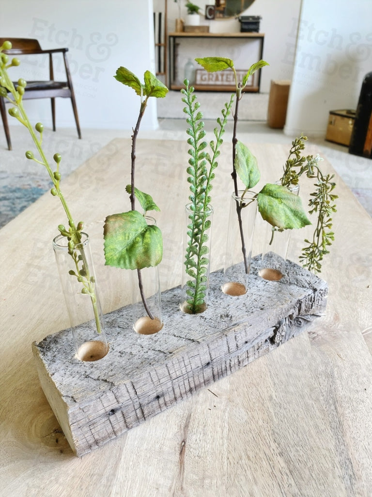 Rustic wooded base and glass propagation tubes for plants. Measures approximately 3.5” wide by 11” long by 8” high. Minimalistic and rustic!