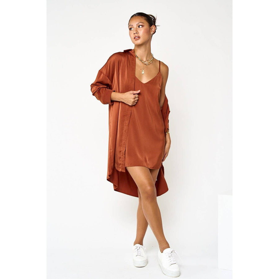 Elevate your loungewear game with this stunning Satin Slip-On Dress and Shirt Set in Cognac. Perfect for a night out or a cozy evening at home, this luxurious set is made from the finest satin and features adjustable straps for a flawless fit. Looking for a unique gift for a fashion-forward friend? This captivating set by Blue Blush is sure to impress with its V-neck slip-on dress and matching silky button down shirt, making it a thoughtful present for any special occasion.