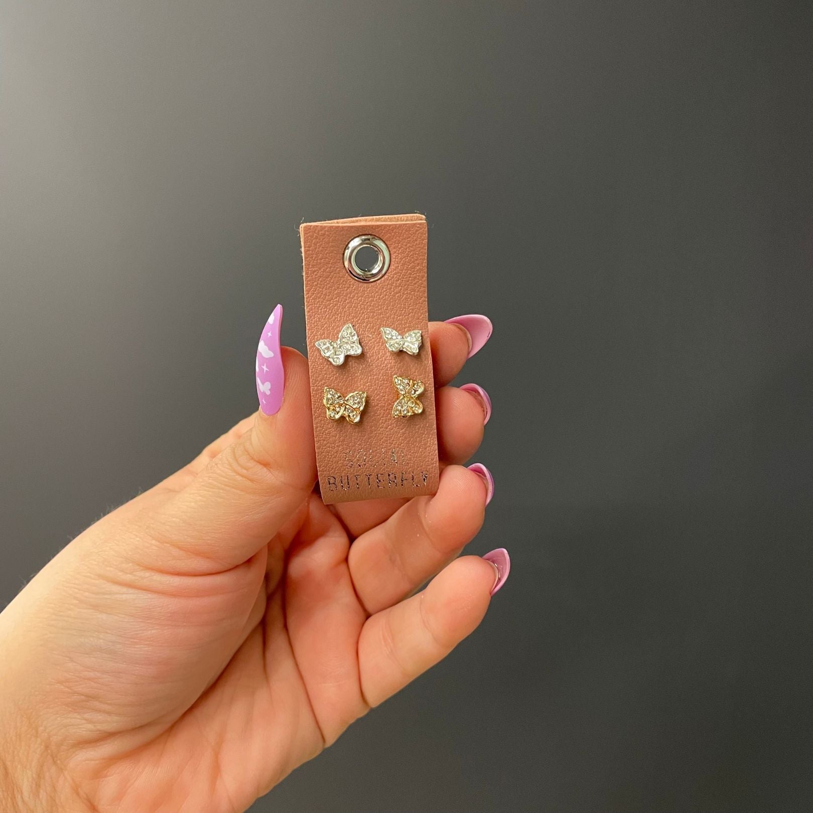 These Social Butterfly Silver Gold Rhinestone Stud Earrings come in a set of 2 pairs, elegantly displayed on a stylish vegan leather tag. The earrings are made of zinc alloy, iron, rhinestone, and PU leather, measuring 1 inch in length and 2.5 inches in width, making them a chic and versatile addition to any jewelry collection by Santa Barbara Design Studio.