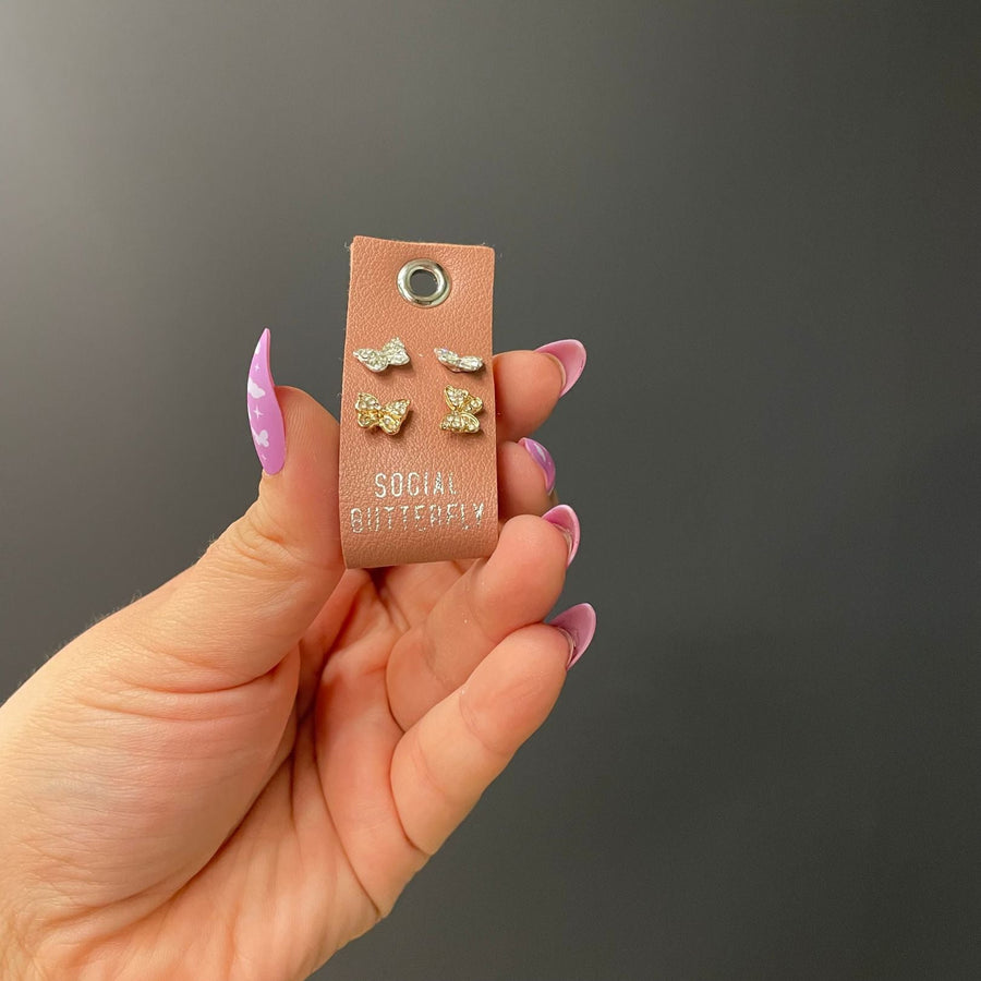 Social Butterfly Silver and Gold Rhinestone Stud Earrings Set | 2 Pairs on a Gift Tag