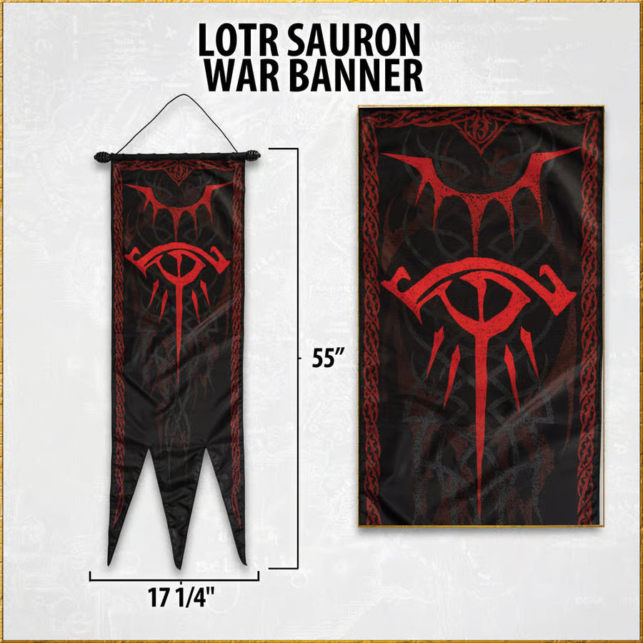 Declare your allegiance to Mordor with the officially licensed Sauron War Banner from The Lord of the Rings. Displaying the unmistakable Eye of Sauron, this banner replicates the ominous symbol carried by the armies of the Dark Lord across Middle-earth. It’s crafted from high-quality nylon cloth with rich detailing and vivid color for dramatic visual appeal. Measuring 55" long by 17 1/4" wide, this banner is ideal for wall display and includes a wooden hanging rod for convenient setup. Whether you're building your own dark tower, outfitting a fan cave, or expanding a LOTR collection, the Sauron War Banner adds a commanding presence to any space.