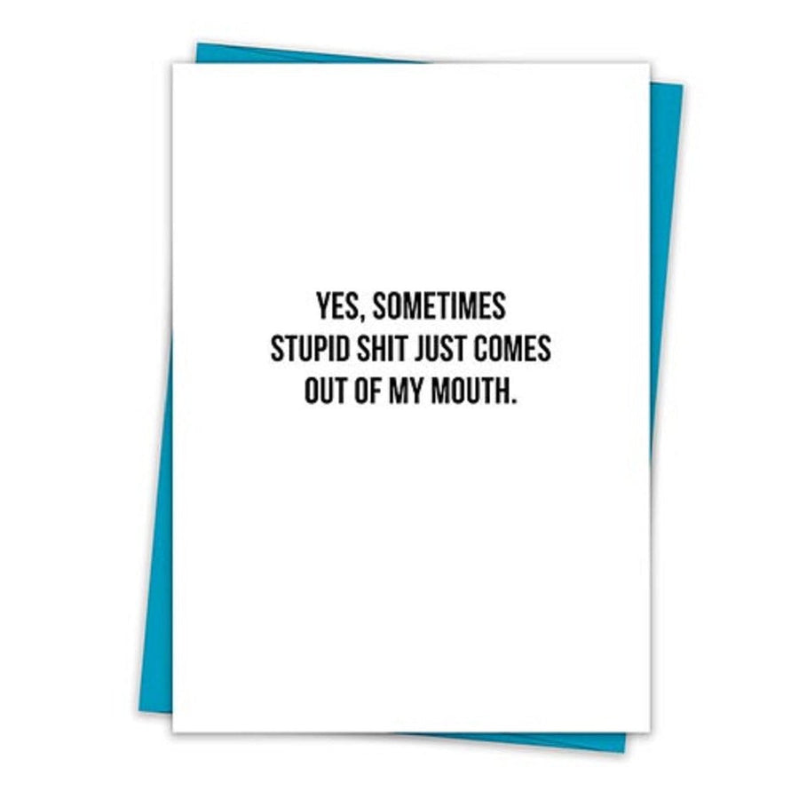 Let someone you love know you're thinking about them by sending this greeting card that reads "YES, SOMETIMES STUPID SHIT JUST COMES OUT OF MY MOUTH."