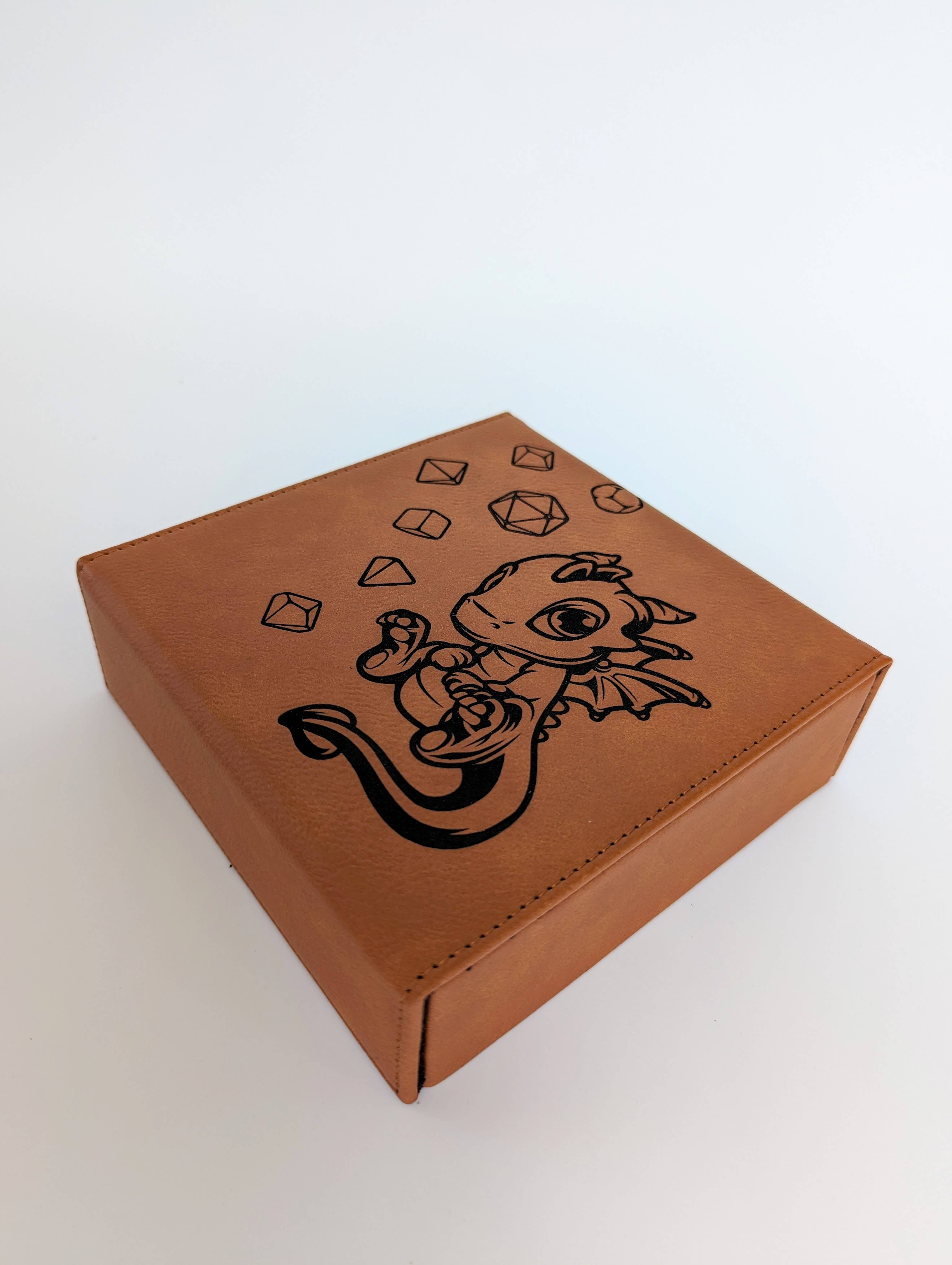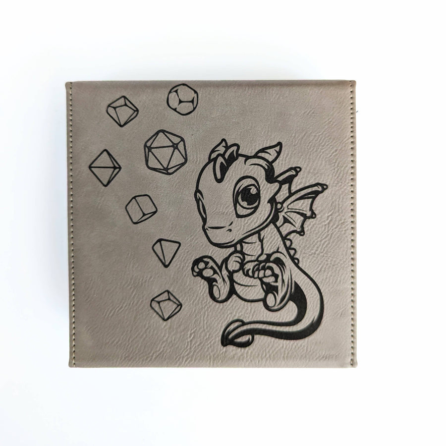 Unleash the ultimate dice experience with the Adoragon Vegan Leather Dice Box, available in both rich chestnut and sleek grey. Crafted from premium vegan leather, this redesigned dice box is both stylish and functional, perfect for tabletop enthusiasts. Now larger at 6”x6”x2”, it comfortably holds multiple sets of dice while serving as a chic dice tray to keep your rolls in check. The magnetic closure ensures a seamless and secure wrap-around look, eliminating the need for an elastic band. Lined with soft velvet for a luxurious touch, this box not only stores your dice but enhances your gaming setup. Each box is uniquely engraved by NTSD Gaming and Bookish Goods in their Texas studio, offering a distinctive piece you won’t find anywhere else.