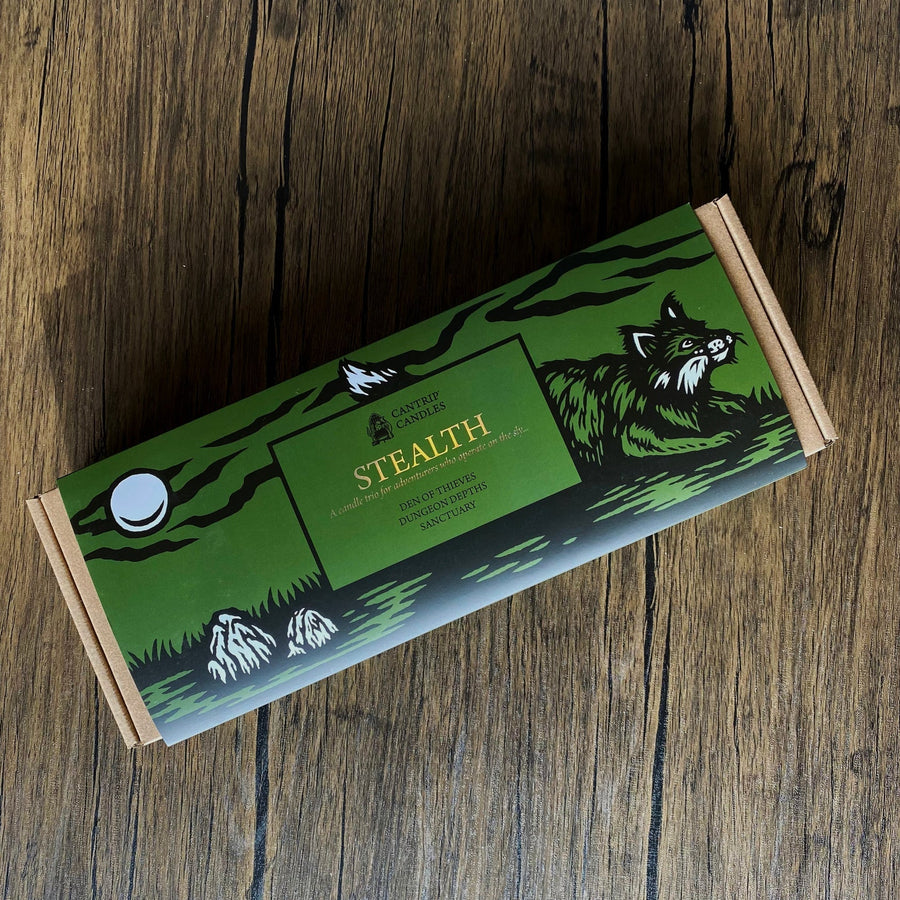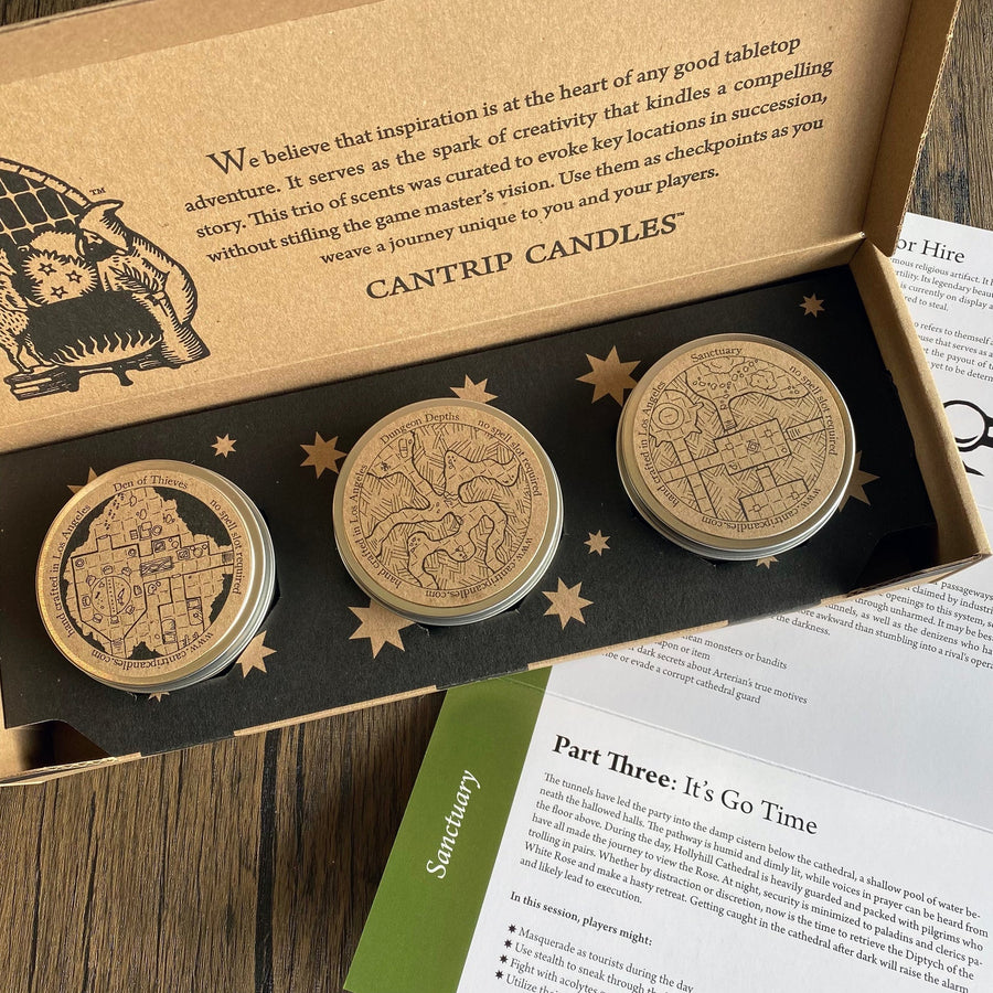 Each Adventure Triptych features a trio of 6 oz. candles with an accompanying storyline curated to guide your next tabletop adventure. The written prompts are plot-point focused to provide inspiration, while allowing a flexibility to take the story in your own direction. Each Adventure Triptych offers a different playstyle, so you can choose the perfect fit for your party!