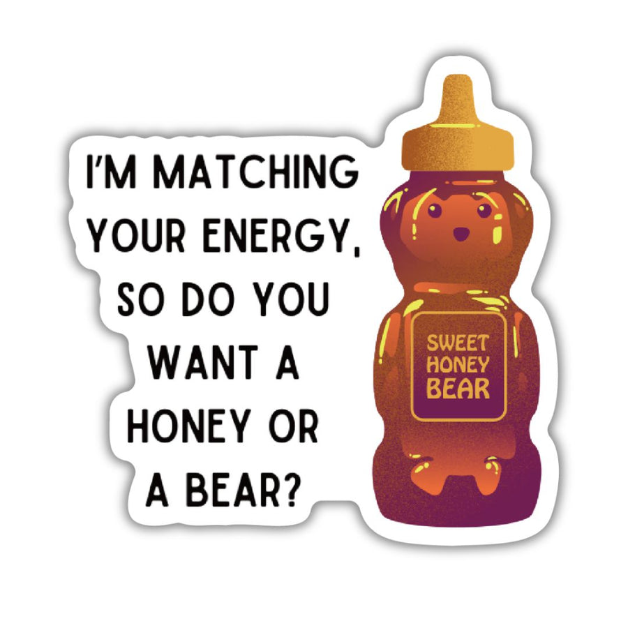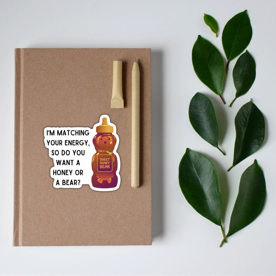 Looking for a fun way to add a touch of humor to your everyday items? The "I'm Matching Your Energy, So Do You Want Honey Or A Bear?" vinyl die cut sticker is the perfect choice! Whether you stick it on your laptop, notebook, or water bottle, this glossy sticker is sure to brighten your day and make a great gift for your fun-loving friends. Get yours today and spread some positivity wherever you go! ππ #vinylsticker #honeyorbear Looking for a unique and quirky gift idea? Look no further than our "I'm Matching Your Energy, So Do You Want Honey Or A Bear?" vinyl die cut sticker! With its vibrant colors and eye-catching design, this sticker is perfect for adding a pop of personality to your car, bike, or any other surface. Give the gift of positivity and humor with this fun sticker that encourages you to choose honey bears over bears every time. ππ» #