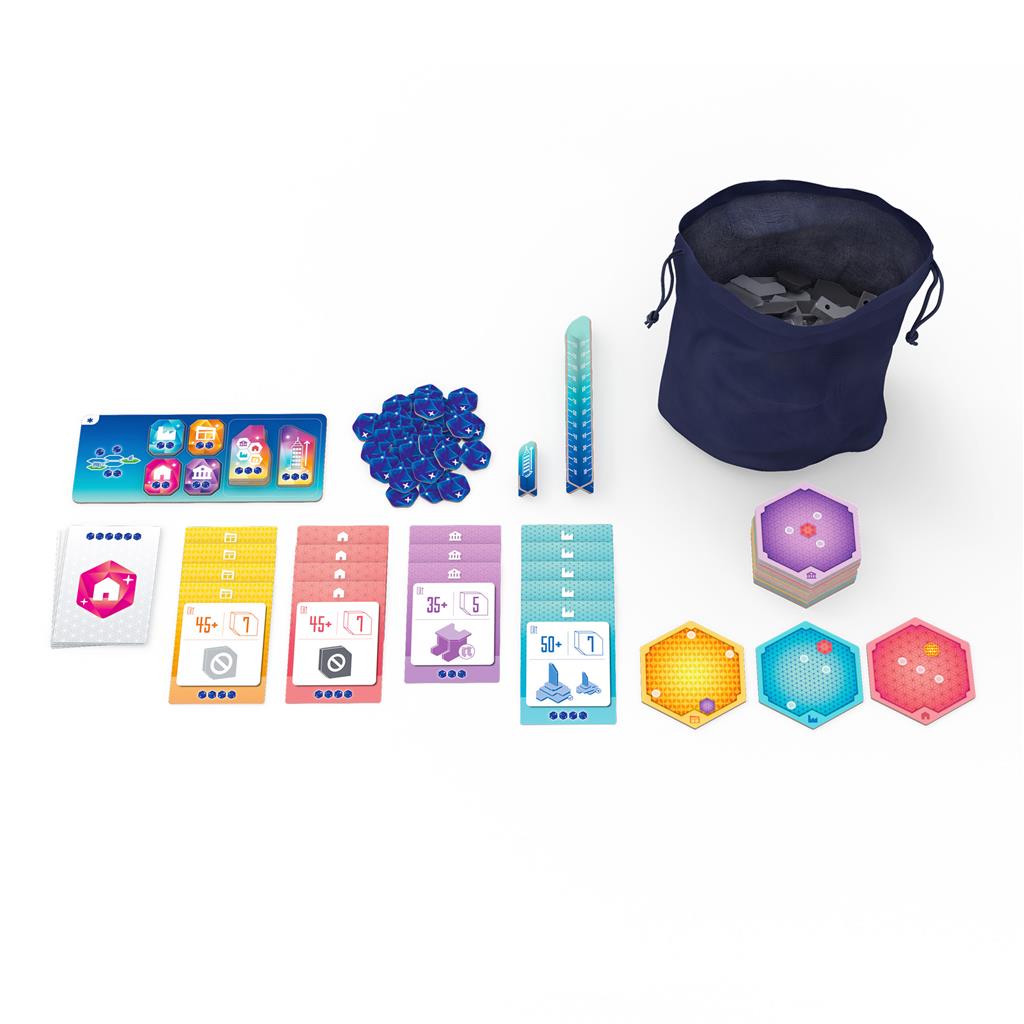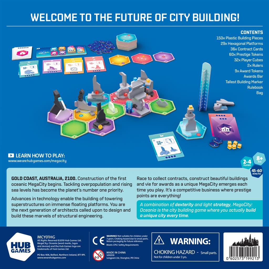 In MegaCity: Oceania, players act as architects tasked with designing a brand new city built on platforms that float on the ocean surface. The game combines a light ruleset with an exciting dexterity based mechanism that levels the playing field for everyone sat at your table. Unlike many other city building games, players actually create a single unique city every time, constructing fantastic looking buildings from our uniquely shaped plastic pieces. Adding the buildings to the city requires stable construction and a steady hand, and the tension increases as they are pushed into position by the player.