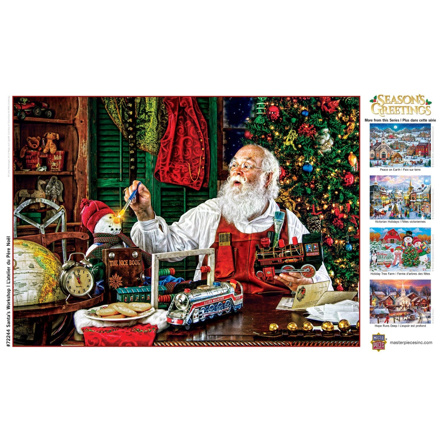 These MasterPieces 19.25" x 26.75" 1000pc of Home for the Holidays features a touch of magic to make toys come to life in Santa's Workshop. The tree is decorated and the toys are made. Santa is putting the finishing touches for good boys and girls.. Holiday Puzzles are the perfect way to get into the holiday spirit, and the perfect holiday presents for friends and family. Cozy up around the table for some holiday family fun! To reduce their impact on our environment, the chipboard used in these puzzles is made of 100% recycled material