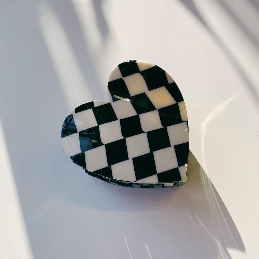 This quirky claw clip features a black and white checkered heart design, perfect for any occasion.