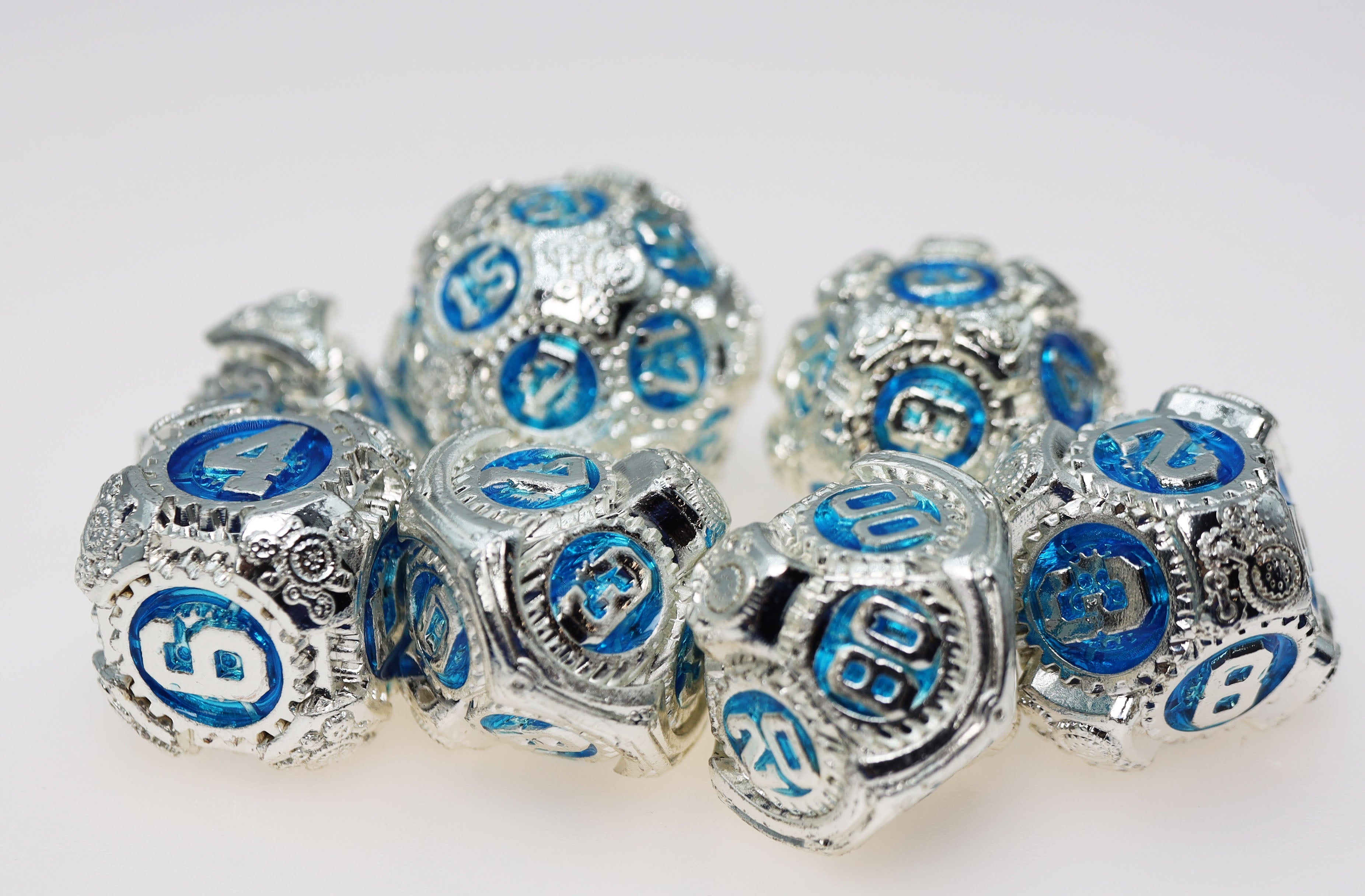 The weathered silver gear patterns stand out beautifully against the deep blue background, making your dice both easy to read and a conversation piece at the table. Crafted from durable metal, these dice are built to survive countless campaigns across both frozen wastes and steam-powered cities.