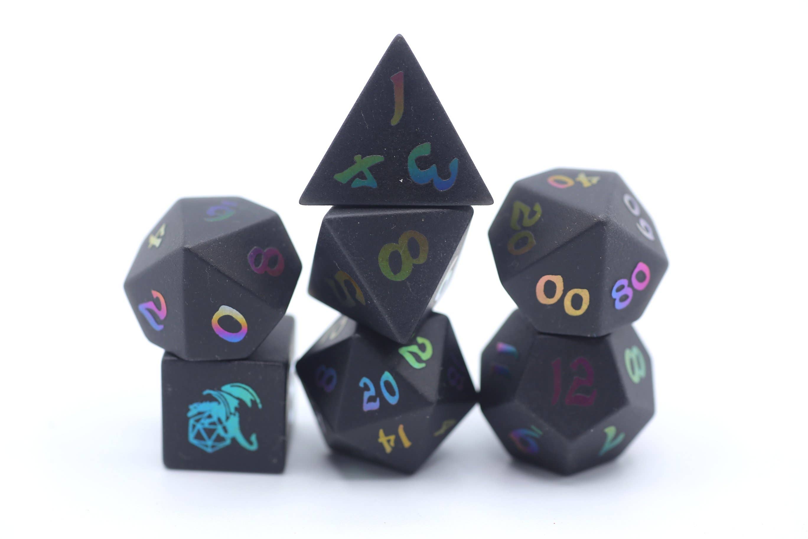 Shadow Whispers: These Gemstone Black Magic dice command attention with their sleek matte black finish and mesmerizing rainbow iridescent numbers that shift colors as they catch the light. Each roll reveals a different spectrum of hues against the darkness – sometimes blue and green, then purple and gold with the next toss. The complete seven-piece polyhedral set includes a special d6 featuring a dragon emblem that brings extra mystique to your tabletop sessions. These premium dice balance perfectly in hand with a satisfying weight that makes every critical roll feel momentous. Perfect for night clerics, shadow sorcerers, or anyone who prefers their magic with a touch of mystery.