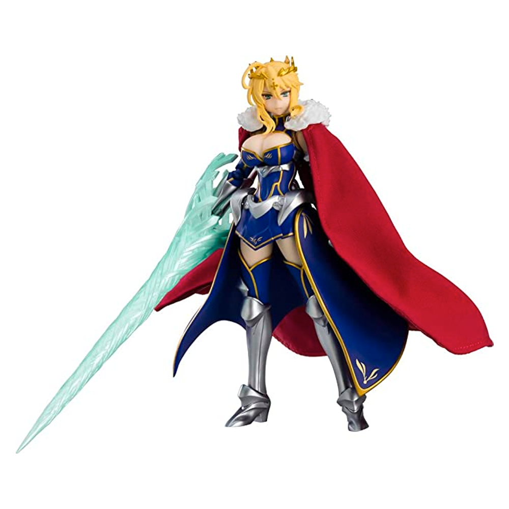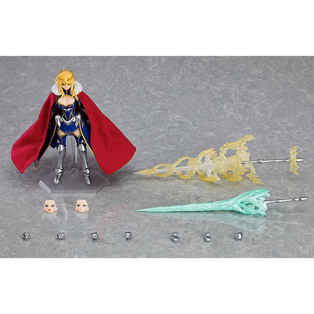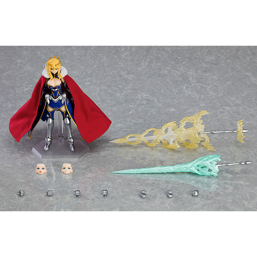 Using the smooth yet posable joints of figma, you can create a variety of poses from the series. A flexible plastic is used for important areas, allowing proportions to be kept without compromising posability. She comes with three face plates including a serious face, a shouting face and a smiling face. Her sacred spear Rhongomyniad is included as an optional part along with a version of Rhongomyniad as it appears when she unleashes her Noble Phantasm. Her cape features a wire in the hem allowing for easy posing. An articulated figma stand is included to display the figma in a variety of poses.