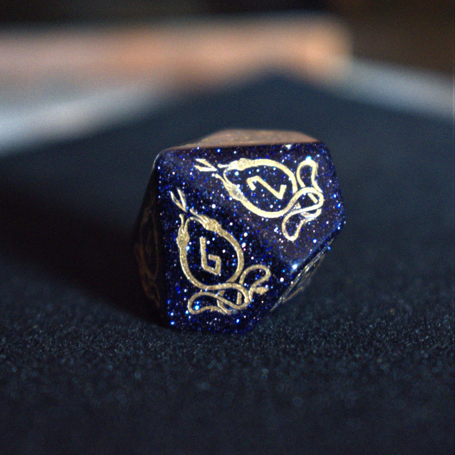 Each die is hand carved from pure gemstone and polished in a proper tumbler. Designs are then engraved into each side and hand painted. Gemstone dice are never guaranteed to have a perfectly balanced weight; however, each of our dice sets are always well weighted and well balanced.