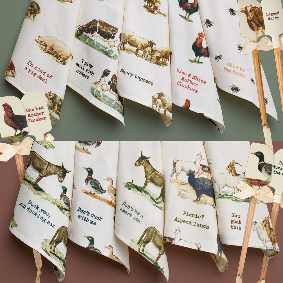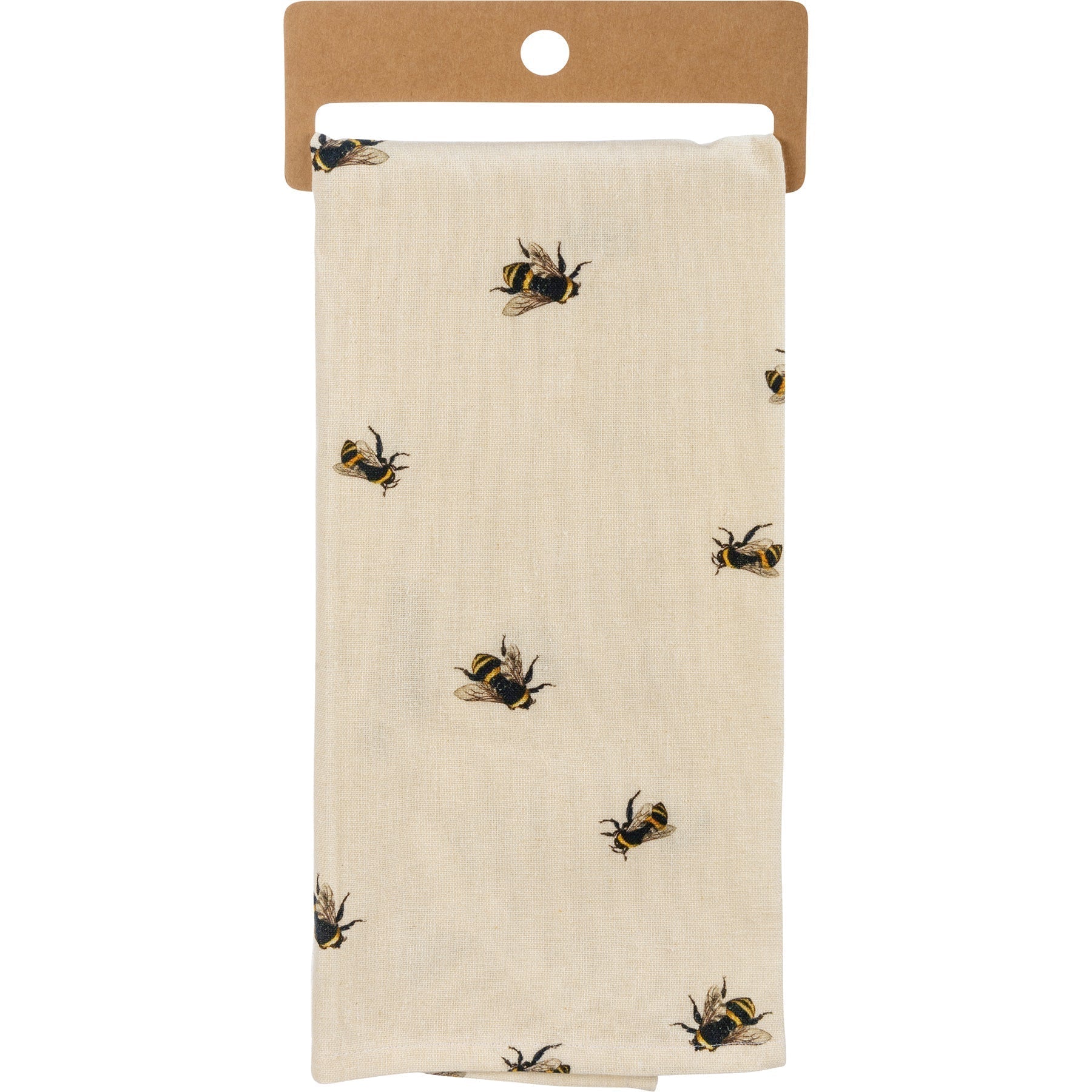 A cotton linen blend kitchen towel featuring all-over vintage-inspired bee designs and punny embroidered "Show Me The Honey" sentiment. Features a cotton tape loop in the corner for easy hanging. Our Show Me The Honey kitchen towel is packaged on a cardboard hanger with a hole to easily hang on rack.