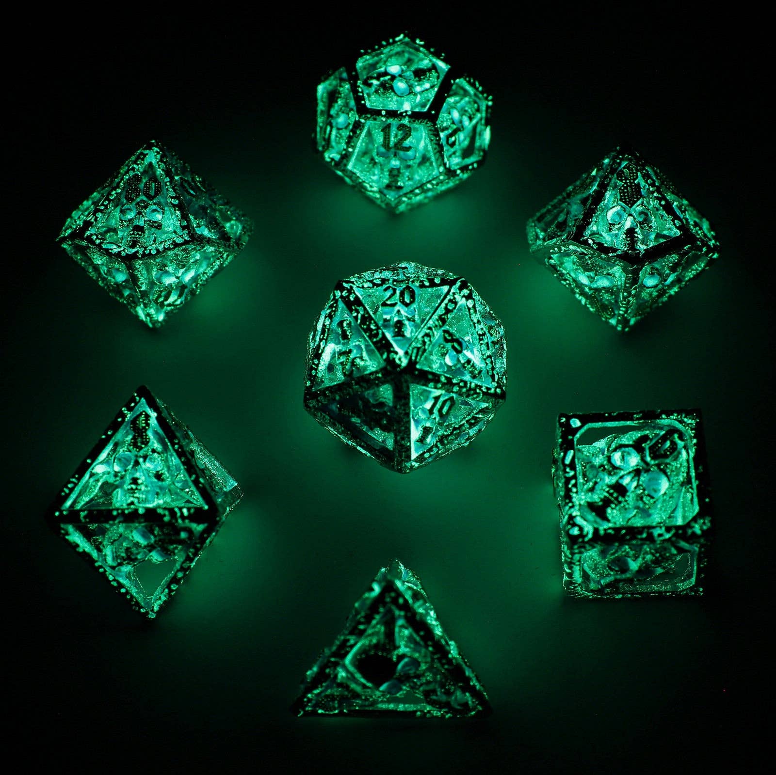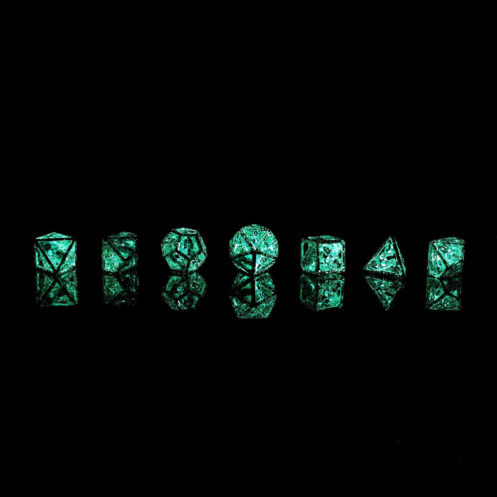 Skull's Grin Hollow Metal Dice Set - Glow in the Dark Blue