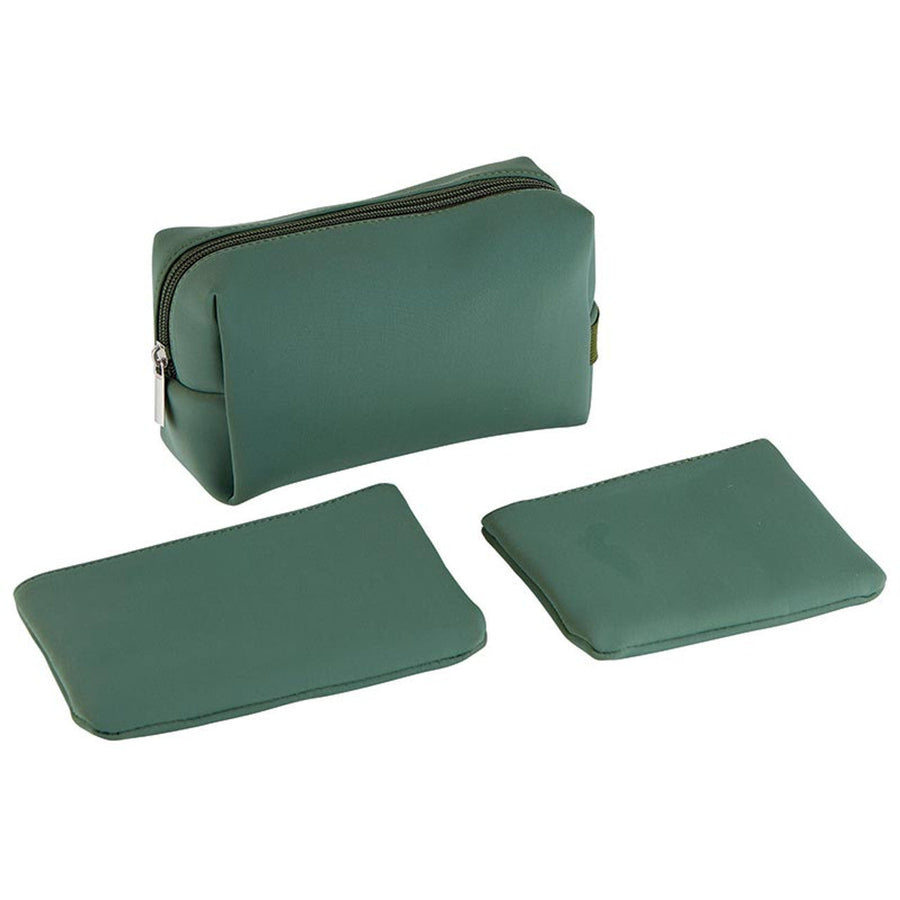 This 3-piece cosmetics bag set in olive green includes small travel pouches perfect for makeup brushes, toiletries, and more. The varying sizes and styles make them versatile for use as a wash bag, travel organizer, or pencil case, making them a practical gift for frequent travelers or makeup enthusiasts.