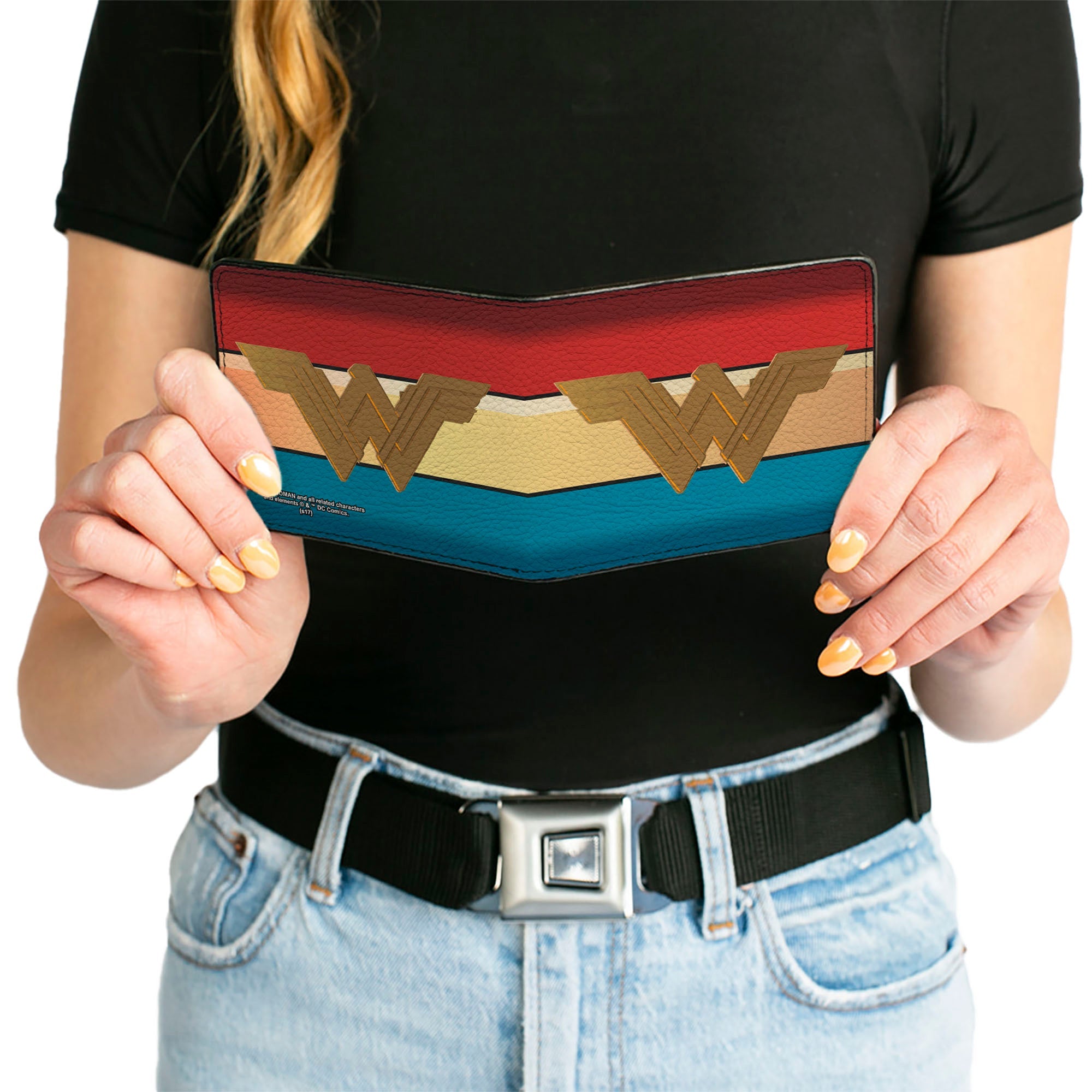 This awesome men's bi-fold wallet is made from premium vegan leather. It measures 4.0x3.5x0.5 Inches, and features the standard billfold, 5 card slots, and windowed ID holder. The logos are applied using advanced printing technologies, so the wallet will still look good after years of hard use. This product is made by Buckle-Down, Inc. and Officially Licensed by DC Comics.