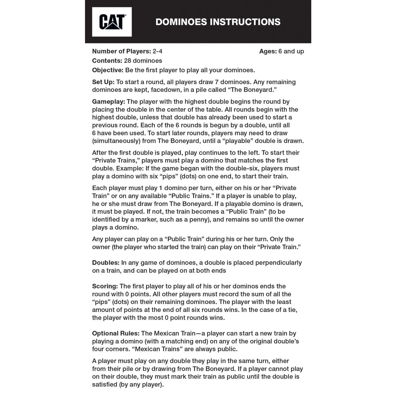 Discover the ultimate game for CAT enthusiasts with the Masterpieces CAT - Caterpillar Dominoes Set. This officially licensed domino tile game is perfect for adults and collectors alike. Encased in a collectible tin box with a window, this set includes 28 white resin dominoes, each adorned with the iconic CAT logo. The durable plastic material ensures longevity, making it ideal for both home play and as a travel dominoes set. Whether you're a fan of domino games or looking to expand your collection, this double 6 dominoes set offers endless entertainment. The set comes complete with easy-to-follow instructions, making it accessible for players of all skill levels. Measuring 7.5 inches in height and length, and 4.5 inches in width, the compact design is perfect for storage and transport. Embrace the colorful dominos theme and enjoy a game that combines tradition with modern style. Proudly crafted by MasterPieces, an American Puzzle & Game Company, this set guarantees quality and enjoyment. Perfect for unisex adults, this game set is a must-have for any CAT collector or domino game enthusiast.