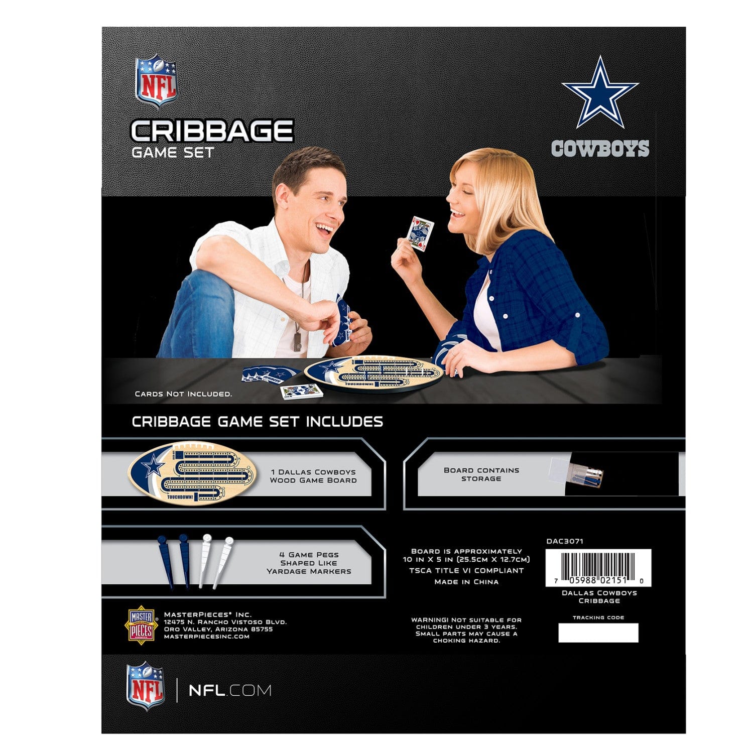 Looking for something fun and challenging to do while cheering on your Dallas Cowboys? Look no further than this MasterPieces officially licensed NFL Dallas Cowboys Cribbage Game Set for adults and families! This set includes a durable wood-finished cribbage game board, shaped like a football, with authentic Dallas Cowboys logos. Peg your way around the board with Yardage Marker Pegs. This Cribbage Game Set is perfect for the ultimate fan of the Dallas Cowboys and Cribbage.