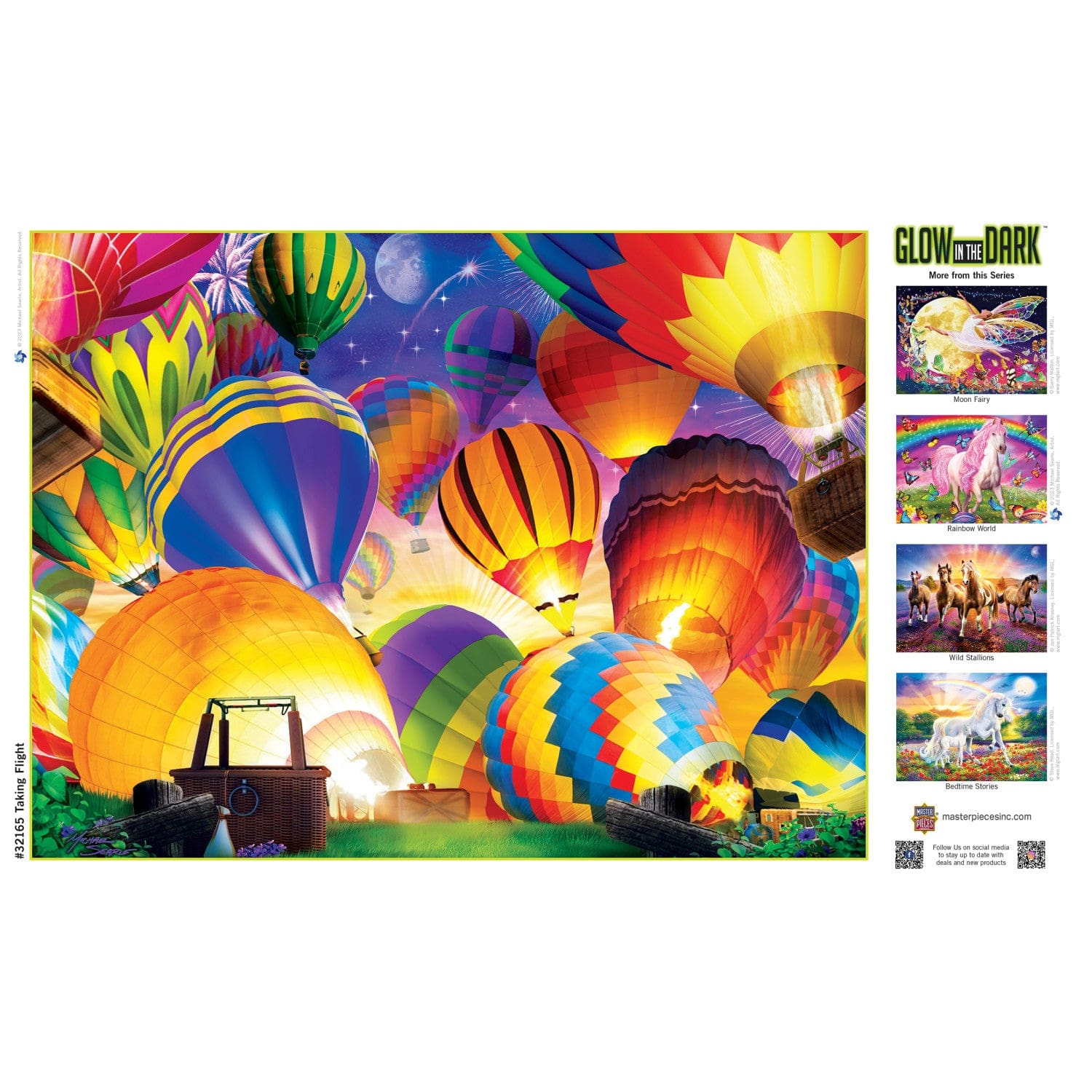 This MasterPieces 18" x 24" 300PC EZ Grip Glow-in-the-Dark Puzzle offers vibrant, exciting scenes, both day and night! The Puzzle Bedtime Stories created by the talented Michael Alan Searle, features Hot air balloons takin flight. For the past twenty-five years Michael Alan Searle has enjoyed a successful career as a freelance illustrator, designer, and creative director. His career has taken him from the tropical islands of Hawaii to the European Continent. The EZ-Grip die-cut used to make this puzzle offers larger puzzle pieces for easier visual and grip that snap together perfectly, without compromising image quality. To reduce their impact on our environment, the chipboard used in these puzzles is made of 100% recycled material.