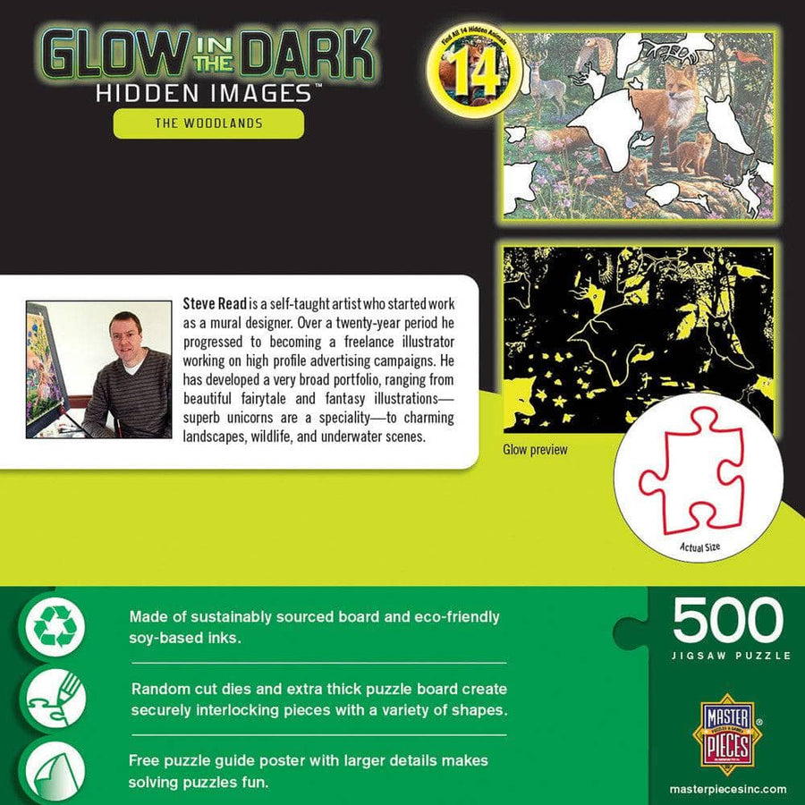 This MasterPieces 15" x 21" 500pc  Hidden Image Glow-in-the-Dark Puzzles features a close-up of a beautiful fox, roaming the forest with all his animal friends. Can you find all 14 hidden animals? Some glow-in-the-dark and others are hiding in plain sight! Artist, Steve Read hides amazing hidden images within each beautiful piece of art, and his puzzles never disappoint. Find all the secrets in these wildly entertaining puzzles! To reduce their impact on our environment, the chipboard used in these puzzles is made of 100% recycled material.