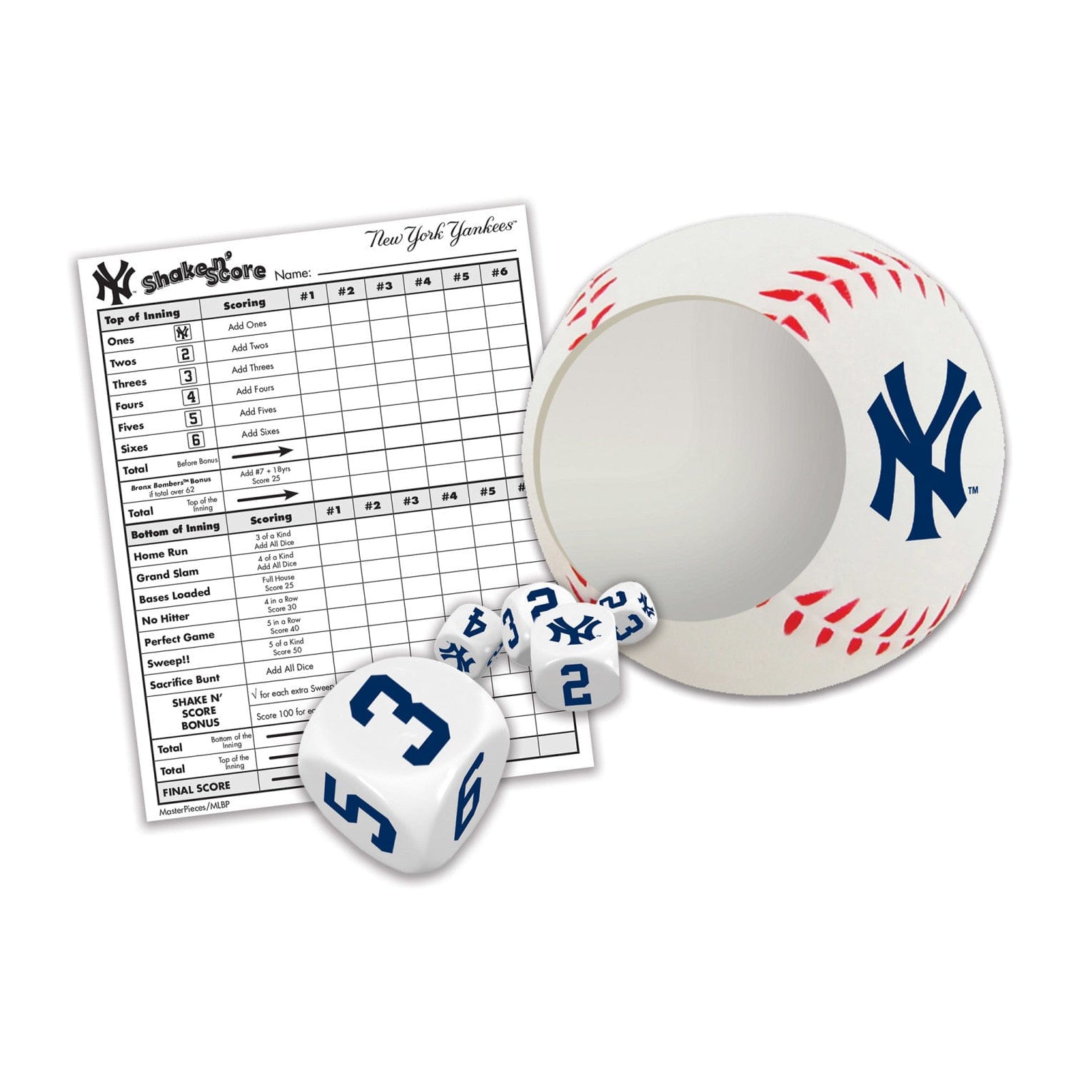 Introducing the Officially Licensed MLB New York Yankees Shake N' Score Dice Game! This MasterPieces New York Yankees Shake n' Score Dice Game is a collectible travel game for New York Yankees fans everywhere! It is perfect for tailgating or having fun at home with the family! Try to get as many points as possible by rolling different combinations of all five dice! The Shake n' Score Dice Game includes a team dice cup, 5 team dice, and an New York Yankees score pad! Two or more fans, ages 6+, can play this travel dice game!