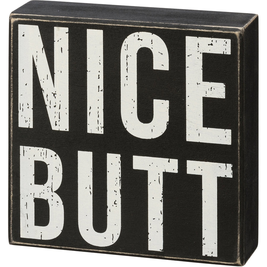 A classic black and white box sign features a distressed "Nice Butt" sentiment. Put it on your toilet tank or hang it on a bathroom wall for laughs. Or put it in the bedroom, your call, buster!
